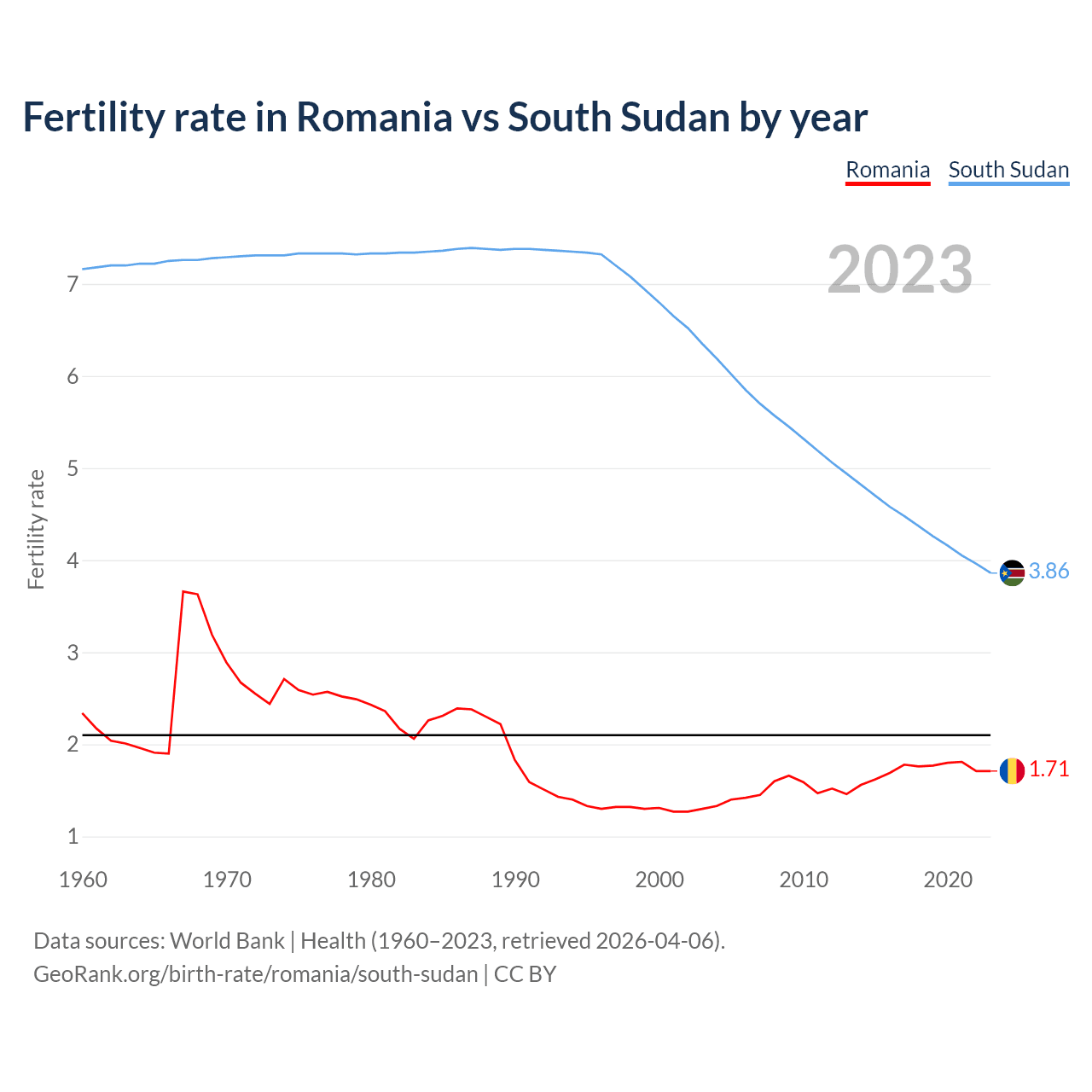 Fertility rate in Romania vs South Sudan by year