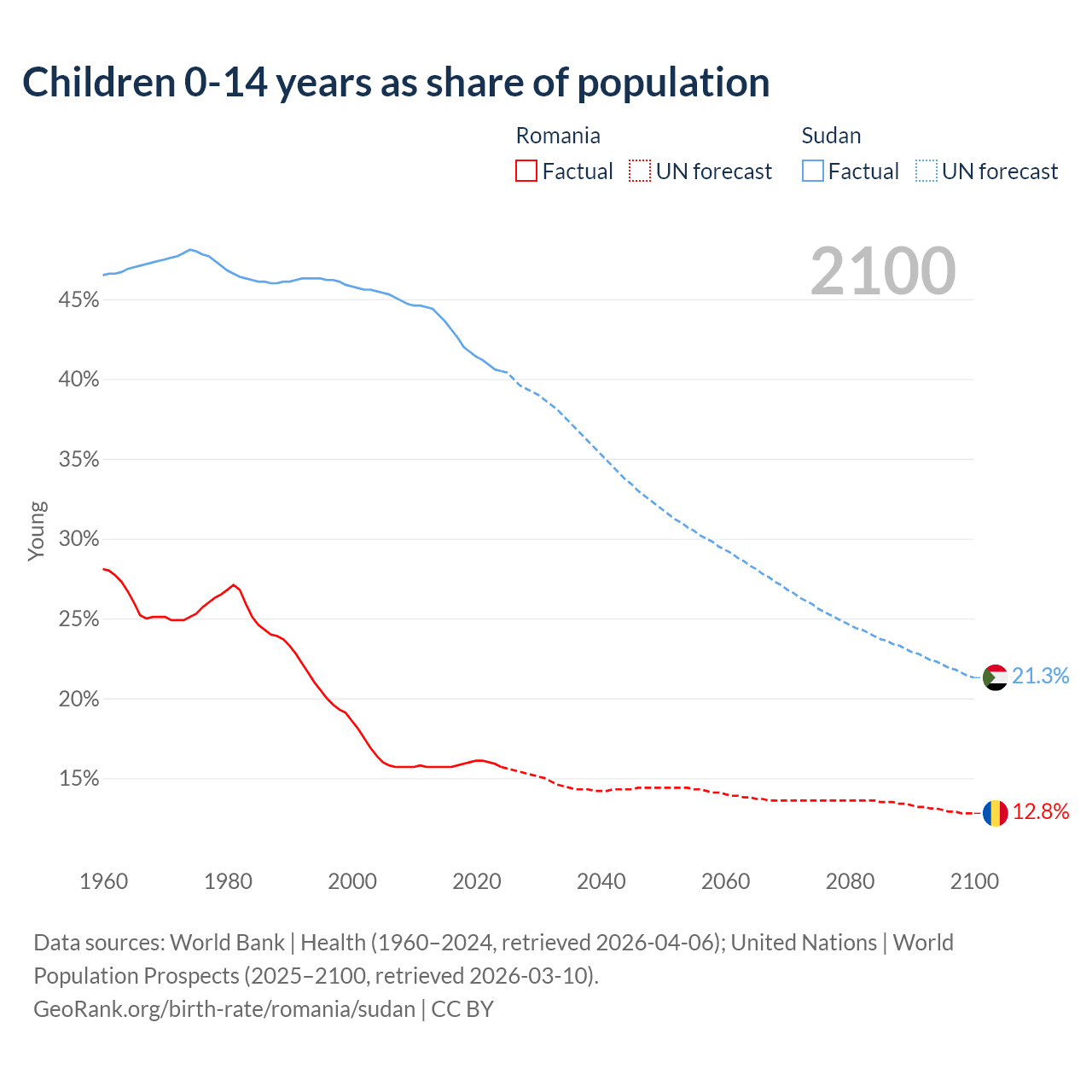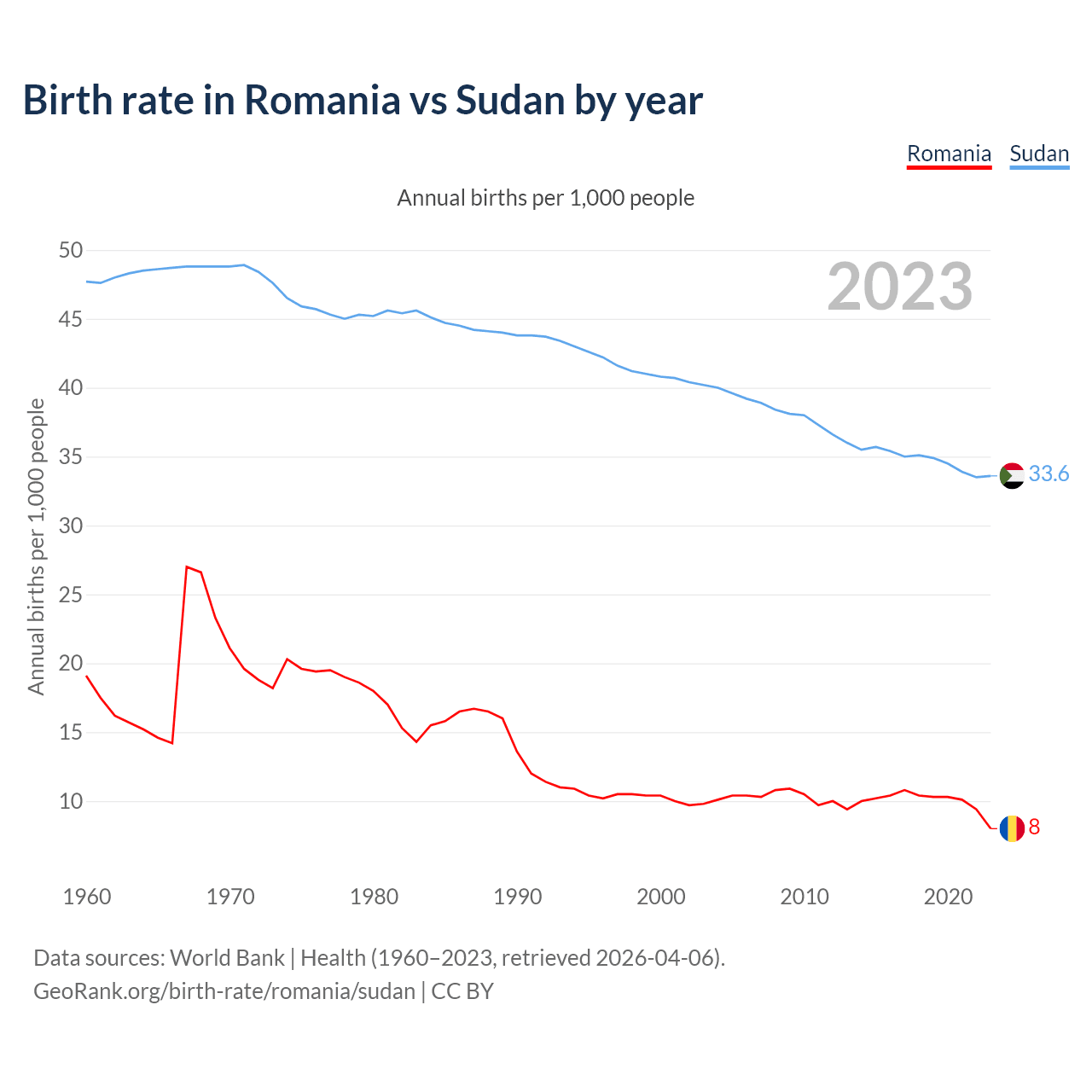 Romania has an annual birth rate of 8 births per 1,000 people, compared to 33.6 for Sudan. The average number of children a woman is expected to have during her lifetime — the fertility rate, is 1.71 in Romania and 4.32 in Sudan — 152.8% difference.