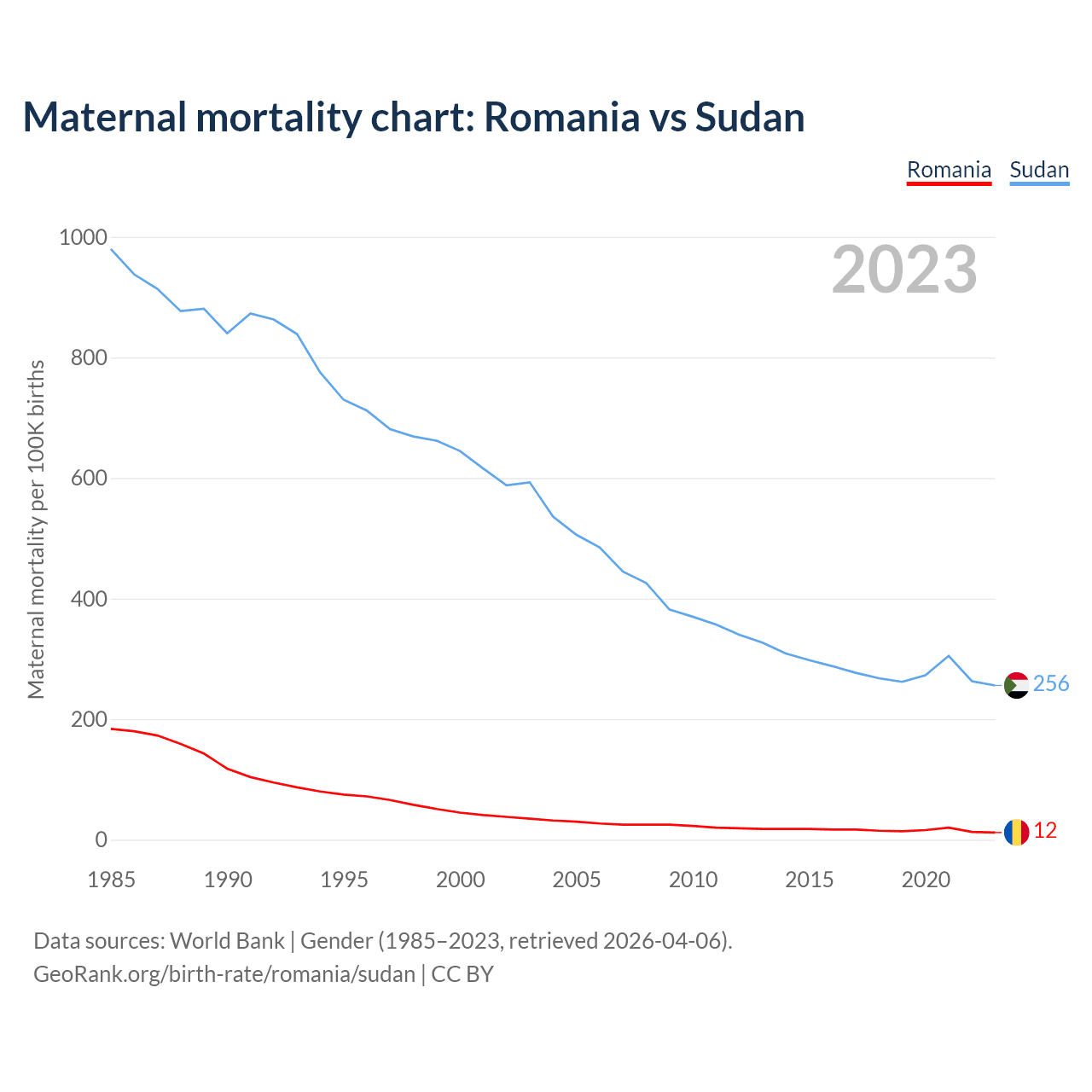 The maternal mortality rate, which is the probability of dying during childbirth or within 42 days of pregnancy termination, is 12 deaths per 100,000 live births in Romania, compared to 256 deaths in Sudan.