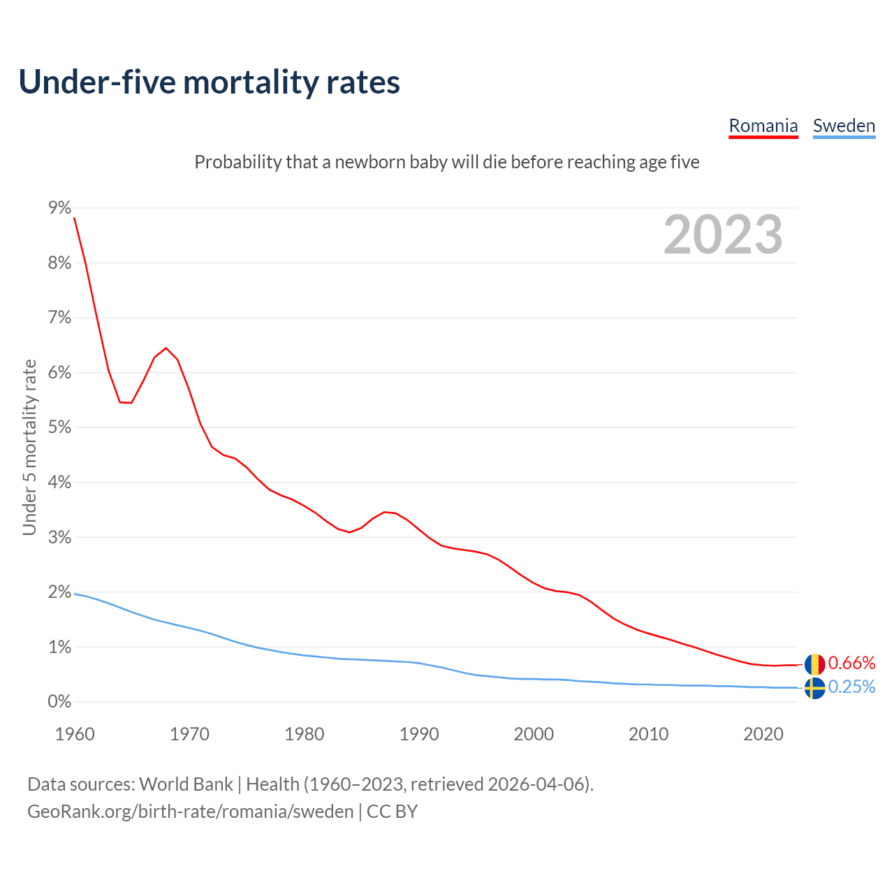 The chance that a newborn baby will die before reaching age five is 0.66% in Romania and 0.25% in Sweden. Above is a chart with historical data on under-five mortality rates.