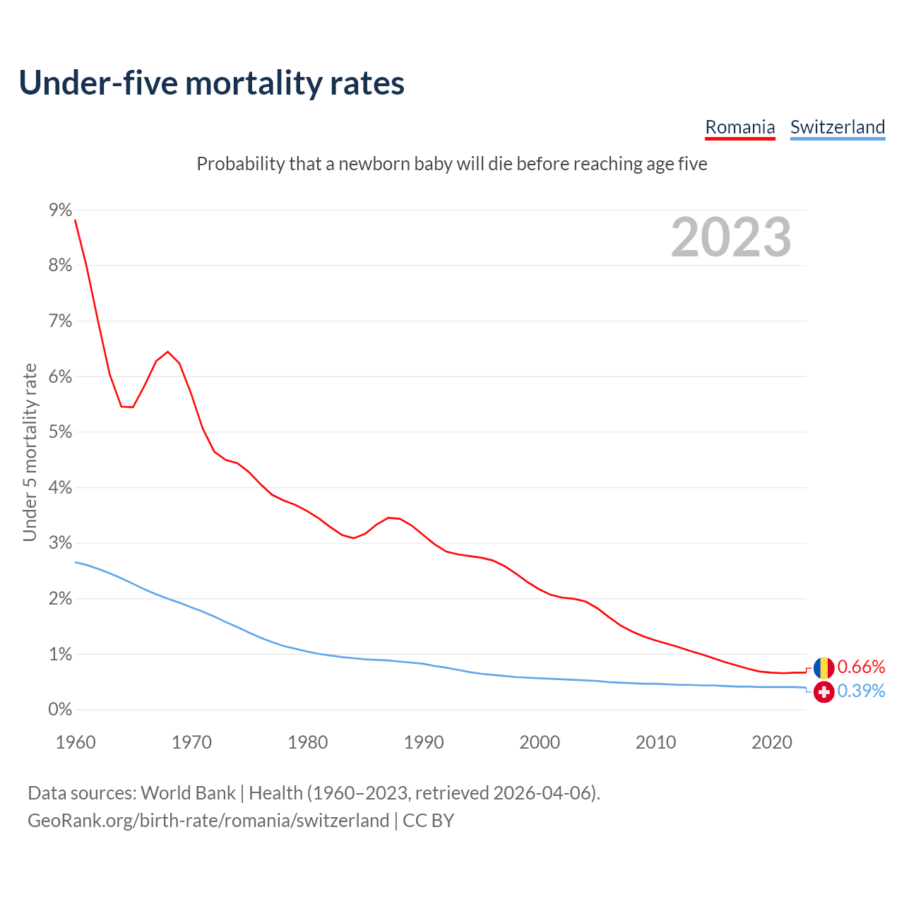 The chance that a newborn baby will die before reaching age five is 0.66% in Romania and 0.39% in Switzerland. Above is a chart with historical data on under-five mortality rates.