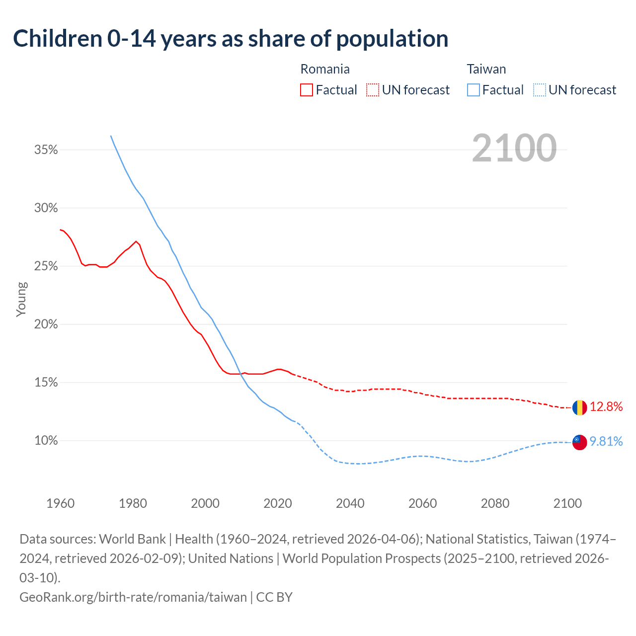 Children aged 0-14 make up 15.7% of the population in Romania and 11.7% in Taiwan in 2024, compared to 23.3% and 27.1% respectively in 1990.