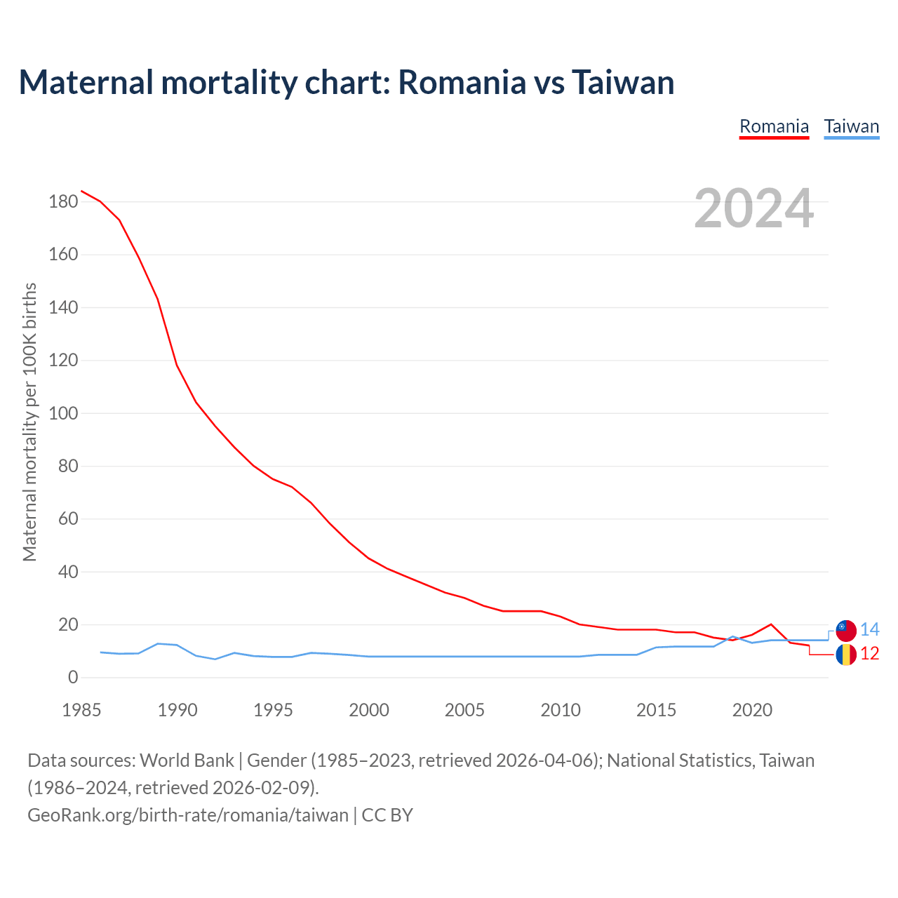 The maternal mortality rate, which is the probability of dying during childbirth or within 42 days of pregnancy termination, is 12 deaths per 100,000 live births in Romania, compared to 14 deaths in Taiwan.