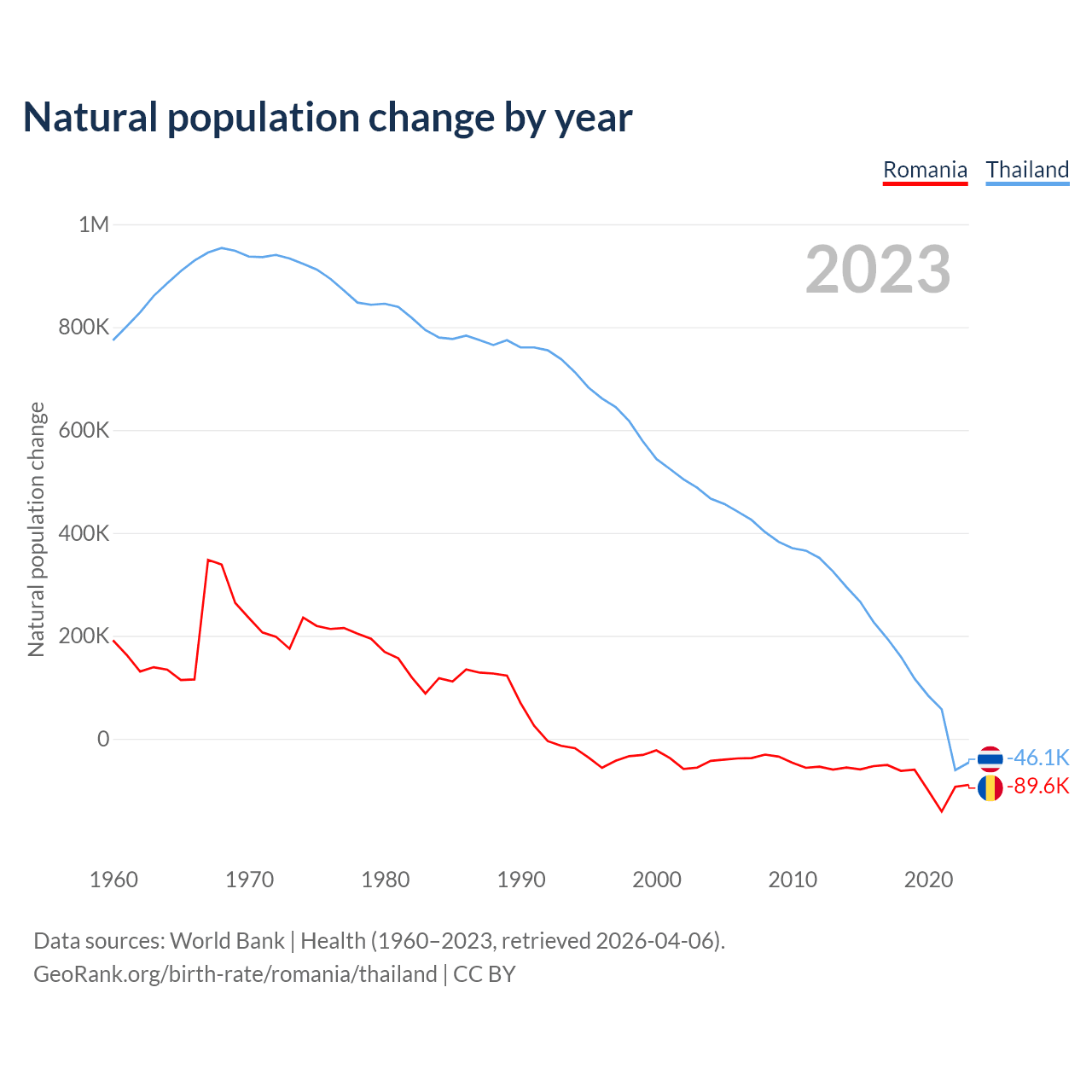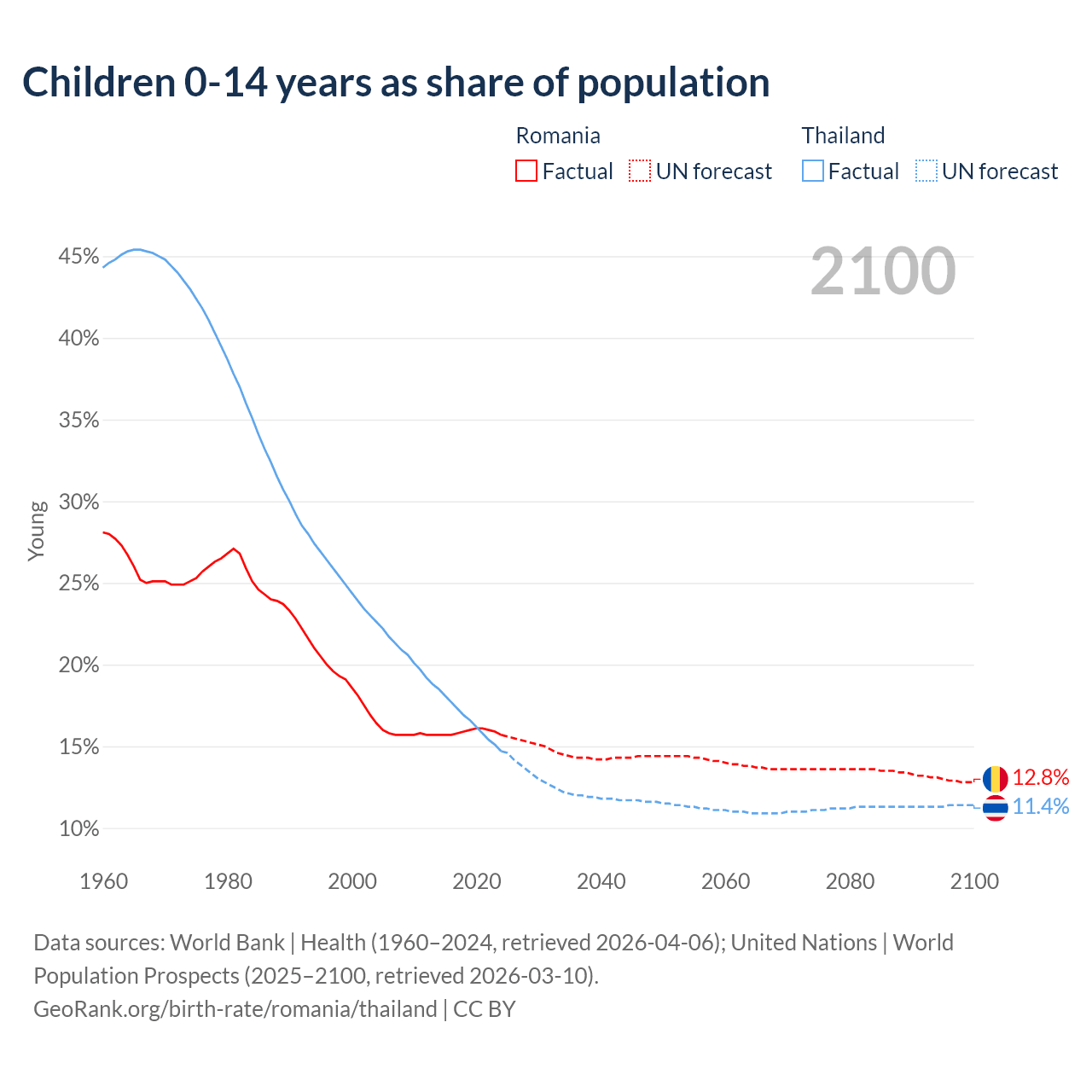According to the latest available data on birth rates, the fertility rate in Romania was 1.71 children per woman in 2023, compared to 1.21 in Thailand in 2023. The replacement level is considered to be 2.1 children per woman.