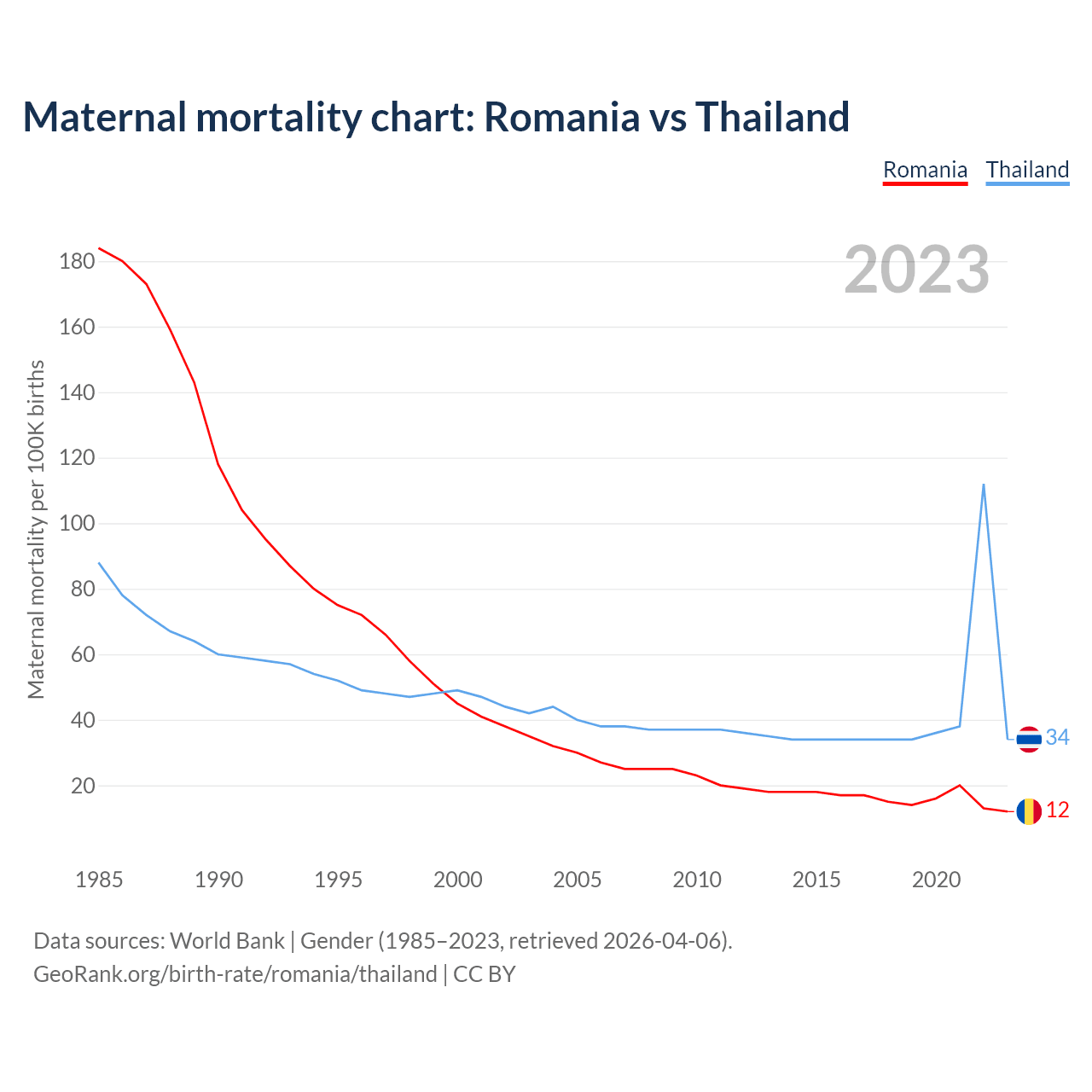 The maternal mortality rate, which is the probability of dying during childbirth or within 42 days of pregnancy termination, is 12 deaths per 100,000 live births in Romania, compared to 34 deaths in Thailand.