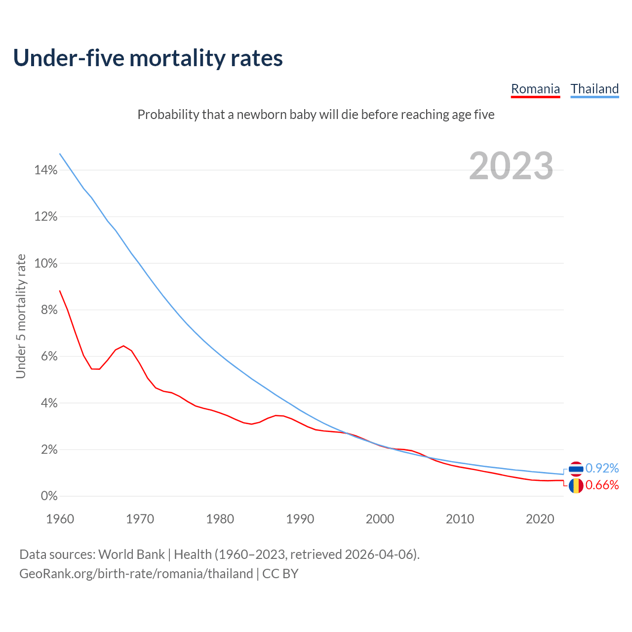 The chance that a newborn baby will die before reaching age five is 0.66% in Romania and 0.92% in Thailand. Above is a chart with historical data on under-five mortality rates.