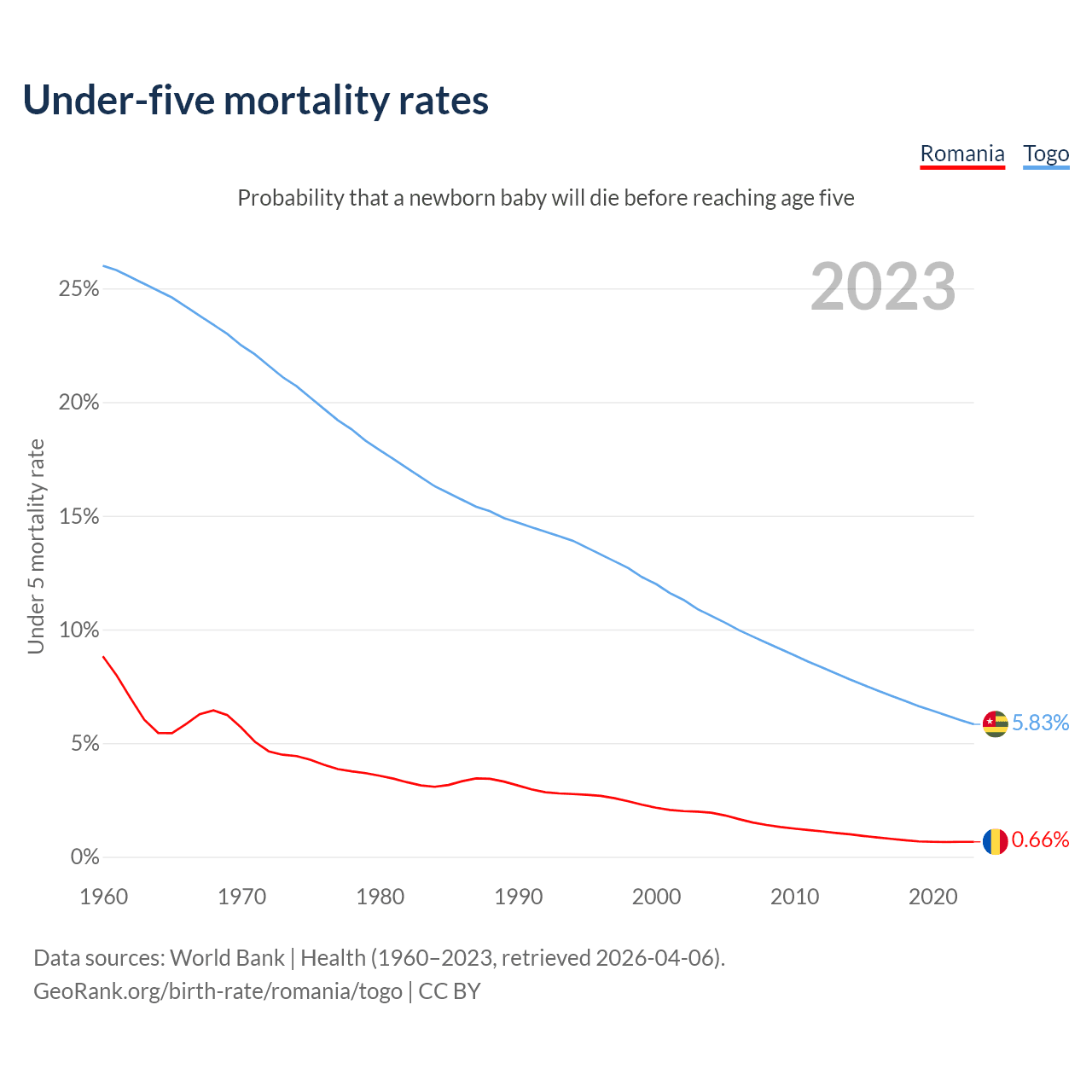 The chance that a newborn baby will die before reaching age five is 0.66% in Romania and 5.83% in Togo. Above is a chart with historical data on under-five mortality rates.