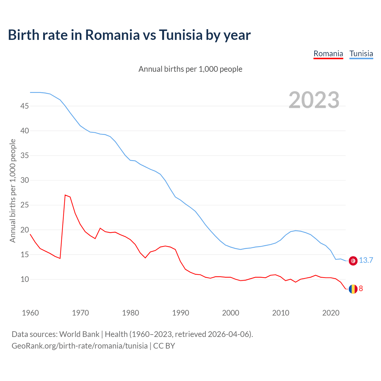 Romania has an annual birth rate of 8 births per 1,000 people, compared to 13.7 for Tunisia. The average number of children a woman is expected to have during her lifetime — the fertility rate, is 1.71 in Romania and 1.83 in Tunisia — 7.13% difference.