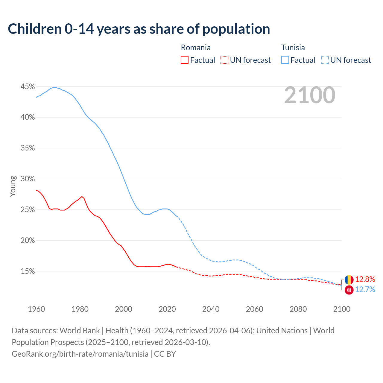 According to the latest available data on birth rates, the fertility rate in Romania was 1.71 children per woman in 2023, compared to 1.83 in Tunisia in 2023. The replacement level is considered to be 2.1 children per woman.