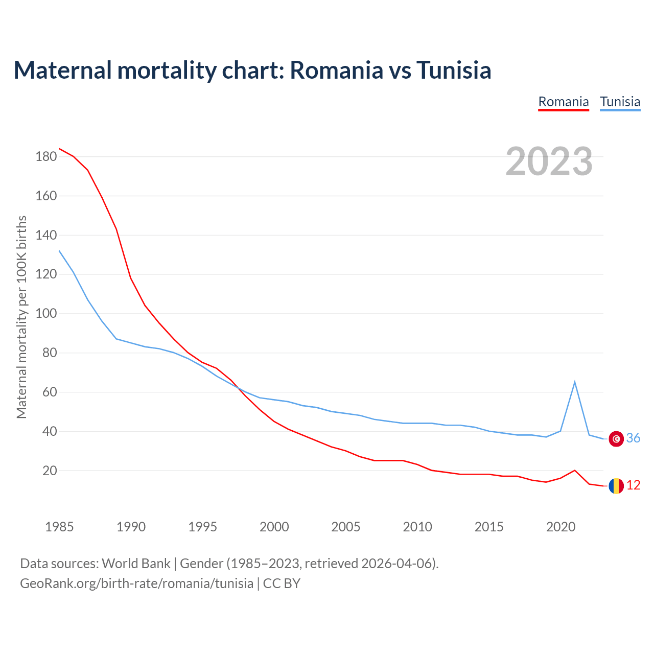 The maternal mortality rate, which is the probability of dying during childbirth or within 42 days of pregnancy termination, is 12 deaths per 100,000 live births in Romania, compared to 36 deaths in Tunisia.