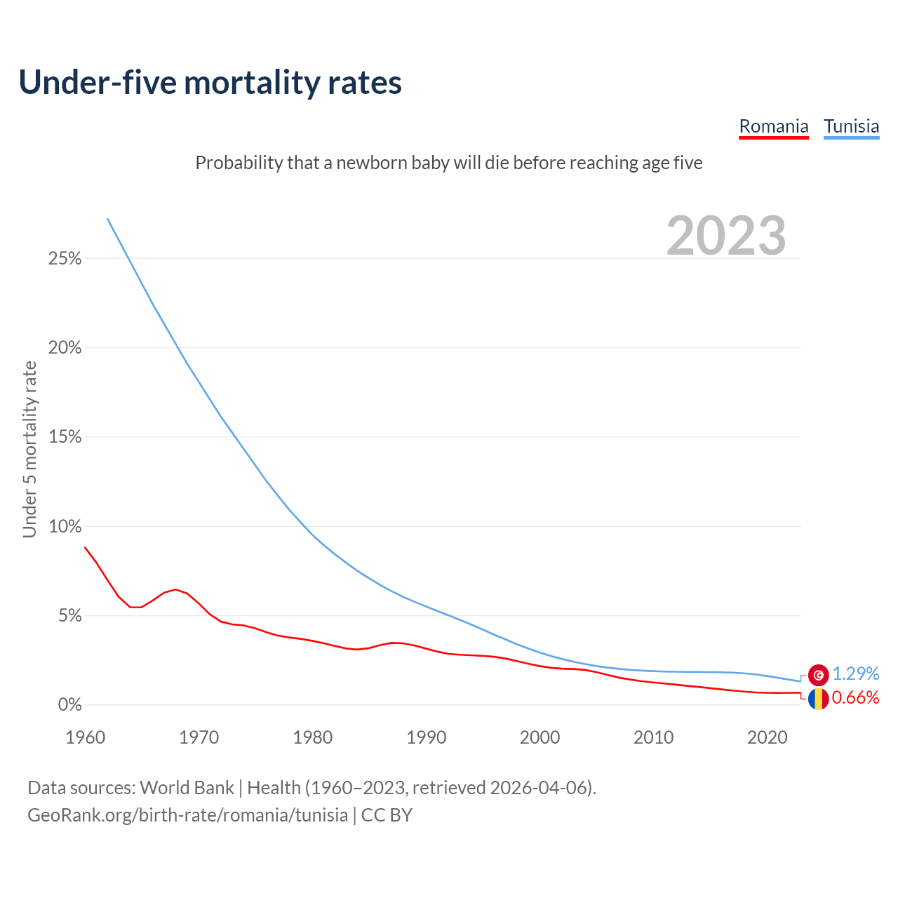 The chance that a newborn baby will die before reaching age five is 0.66% in Romania and 1.29% in Tunisia. Above is a chart with historical data on under-five mortality rates.