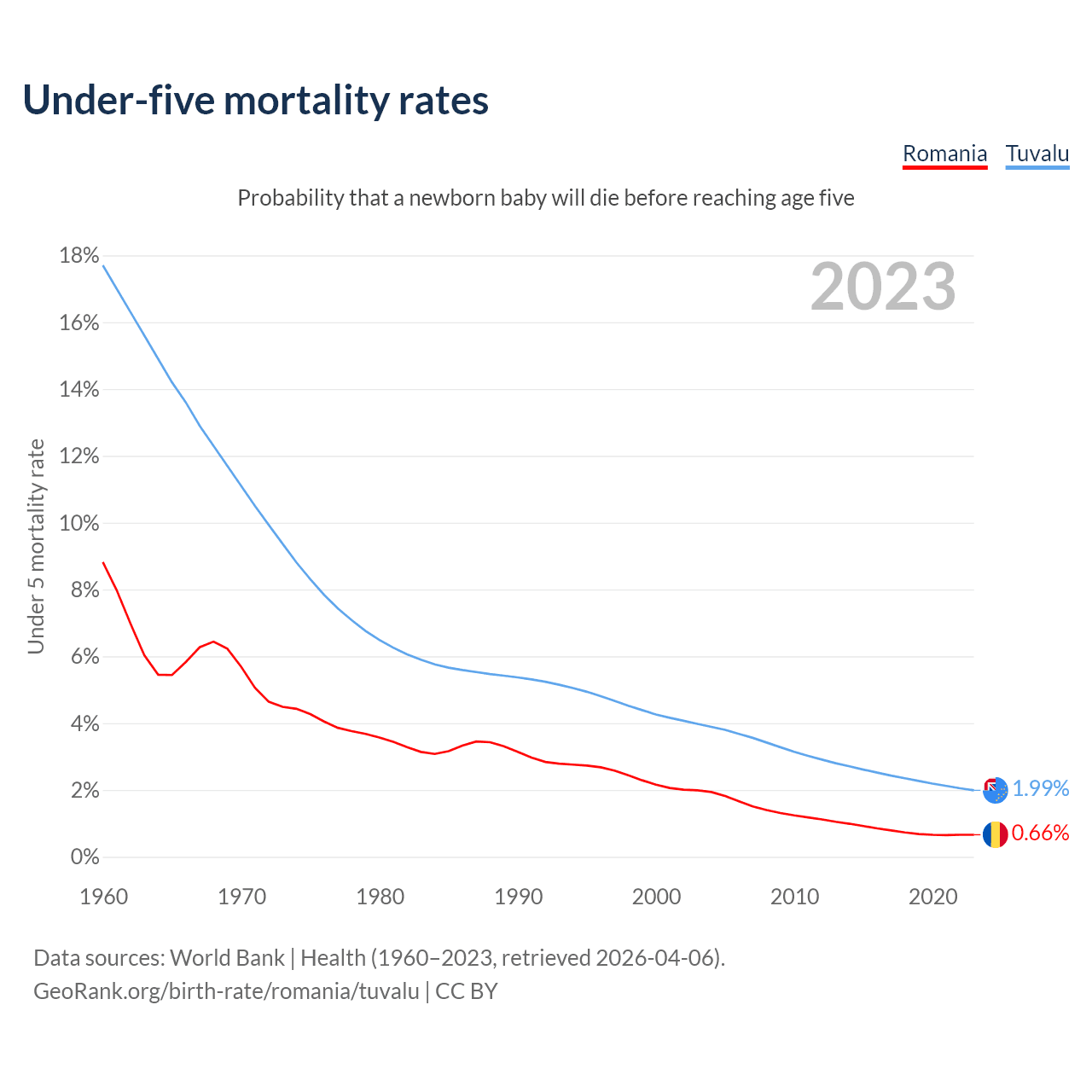 The chance that a newborn baby will die before reaching age five is 0.66% in Romania and 1.99% in Tuvalu. Above is a chart with historical data on under-five mortality rates.