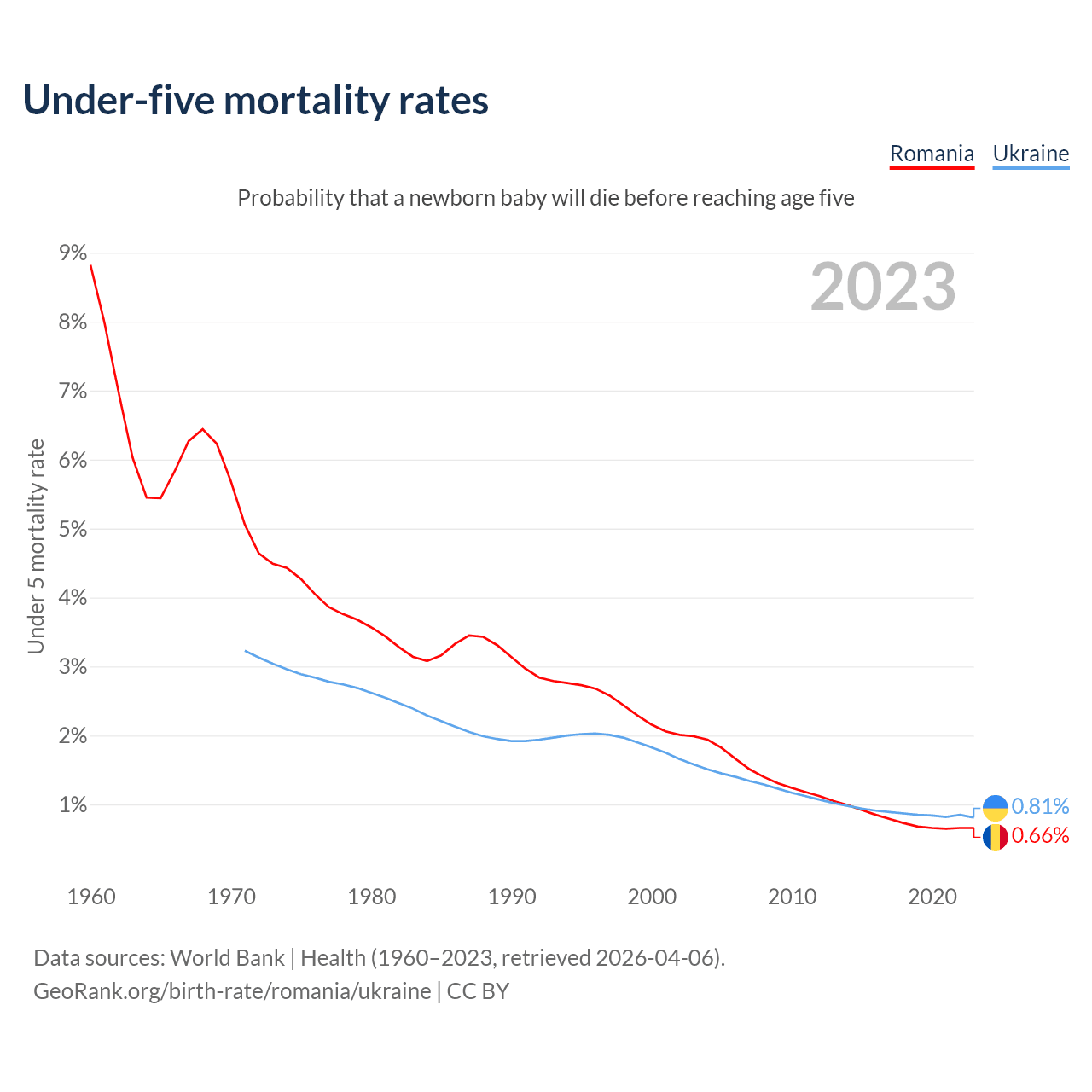 The chance that a newborn baby will die before reaching age five is 0.66% in Romania and 0.81% in Ukraine. Above is a chart with historical data on under-five mortality rates.