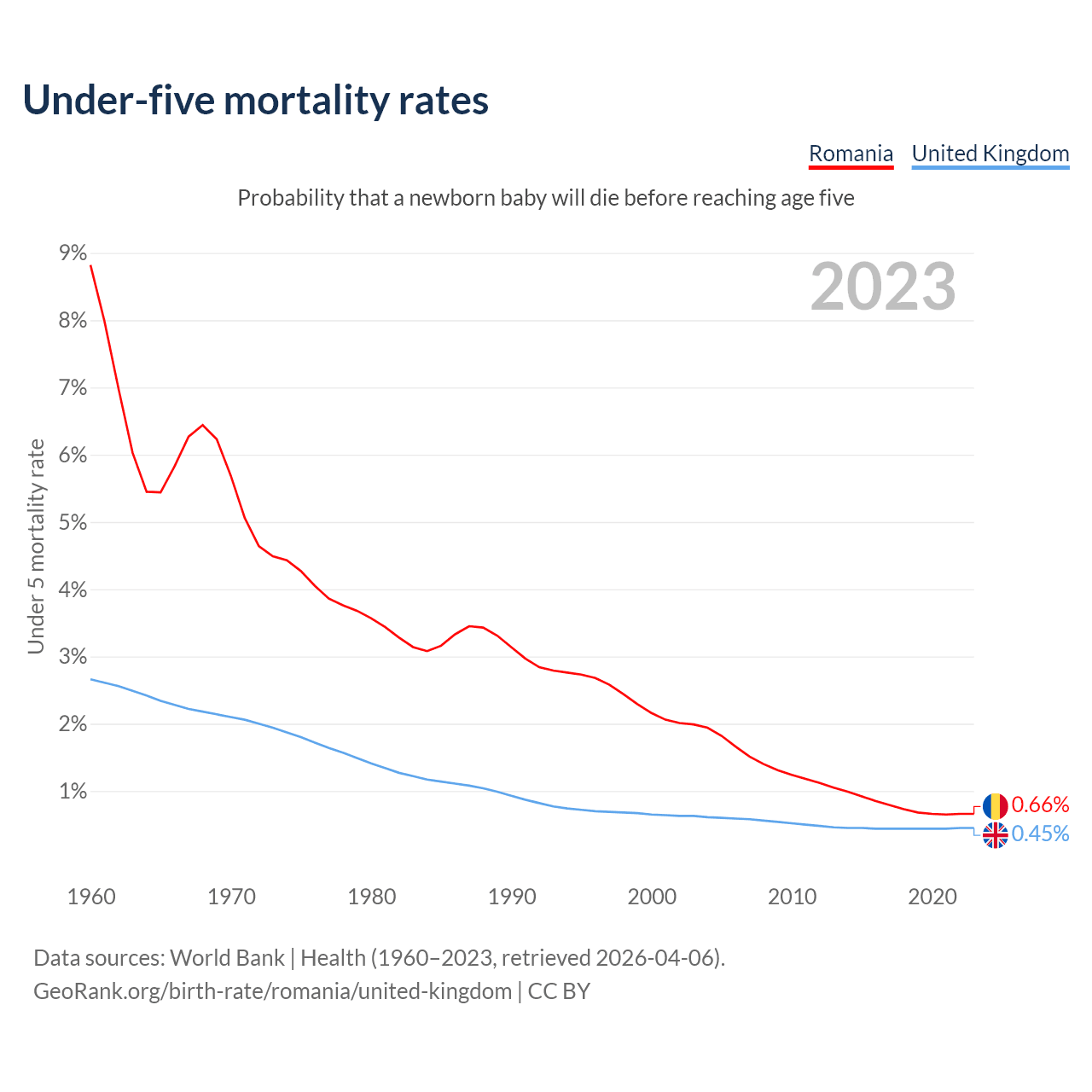 The chance that a newborn baby will die before reaching age five is 0.66% in Romania and 0.45% in the United Kingdom. Above is a chart with historical data on under-five mortality rates.