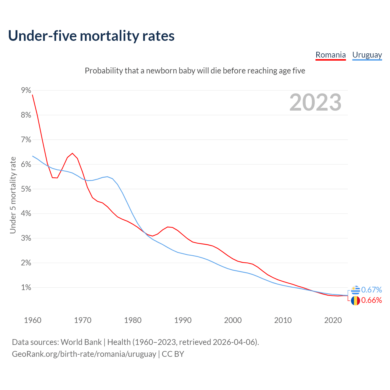 The chance that a newborn baby will die before reaching age five is 0.66% in Romania and 0.67% in Uruguay. Above is a chart with historical data on under-five mortality rates.