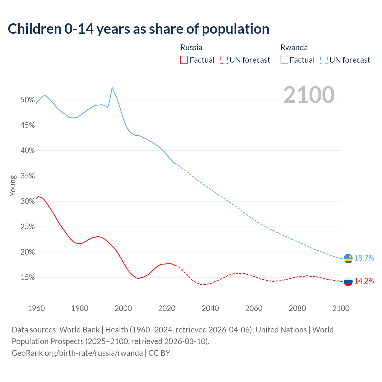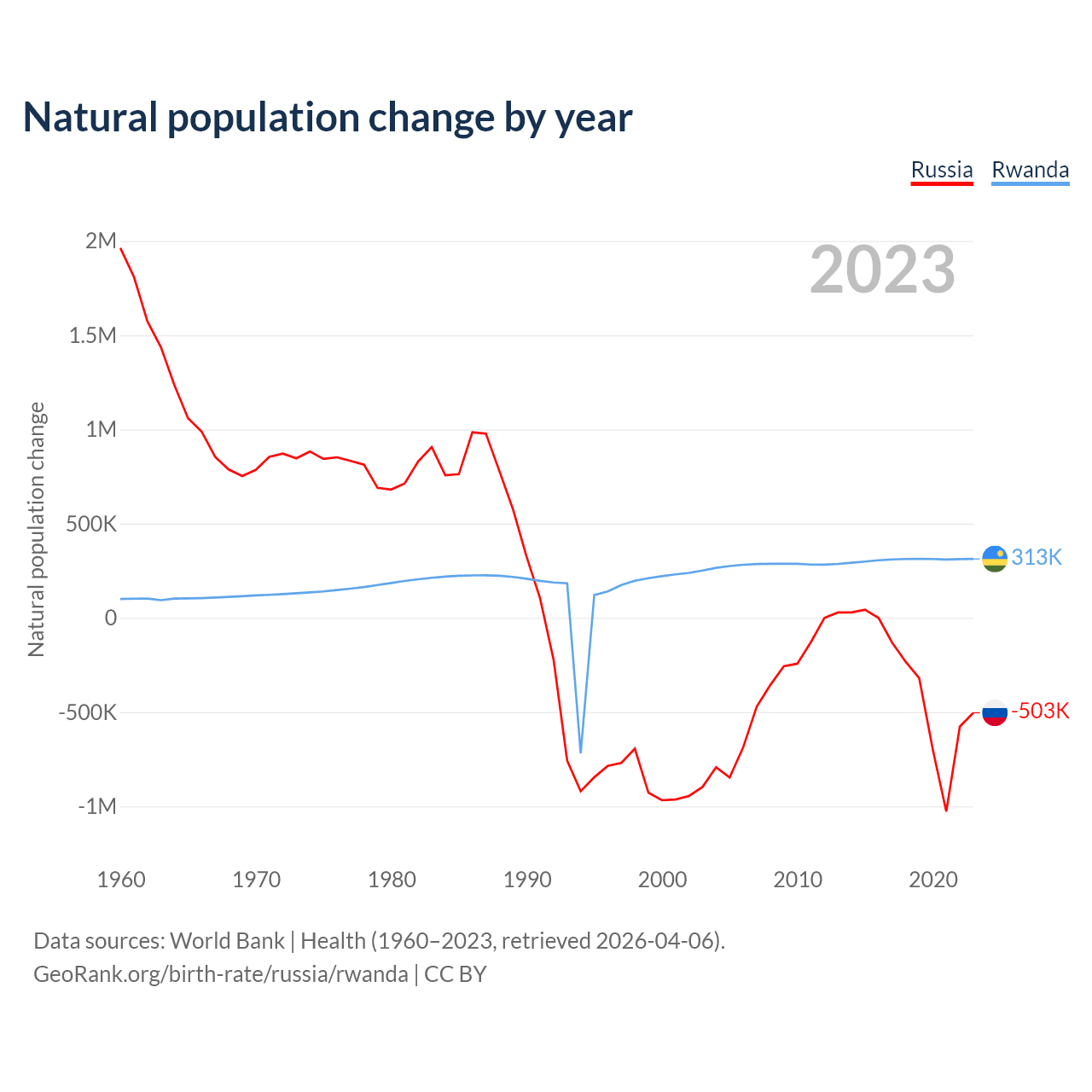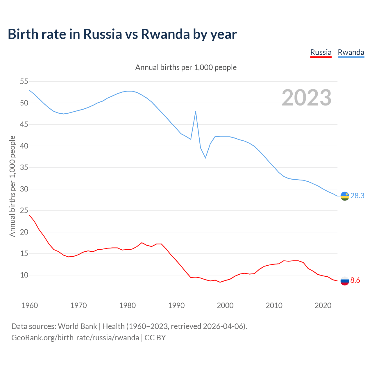 Russia has an annual birth rate of 8.6 births per 1,000 people, compared to 28.3 for Rwanda. The average number of children a woman is expected to have during her lifetime — the fertility rate, is 1.41 in Russia and 3.7 in Rwanda — 162.3% difference.