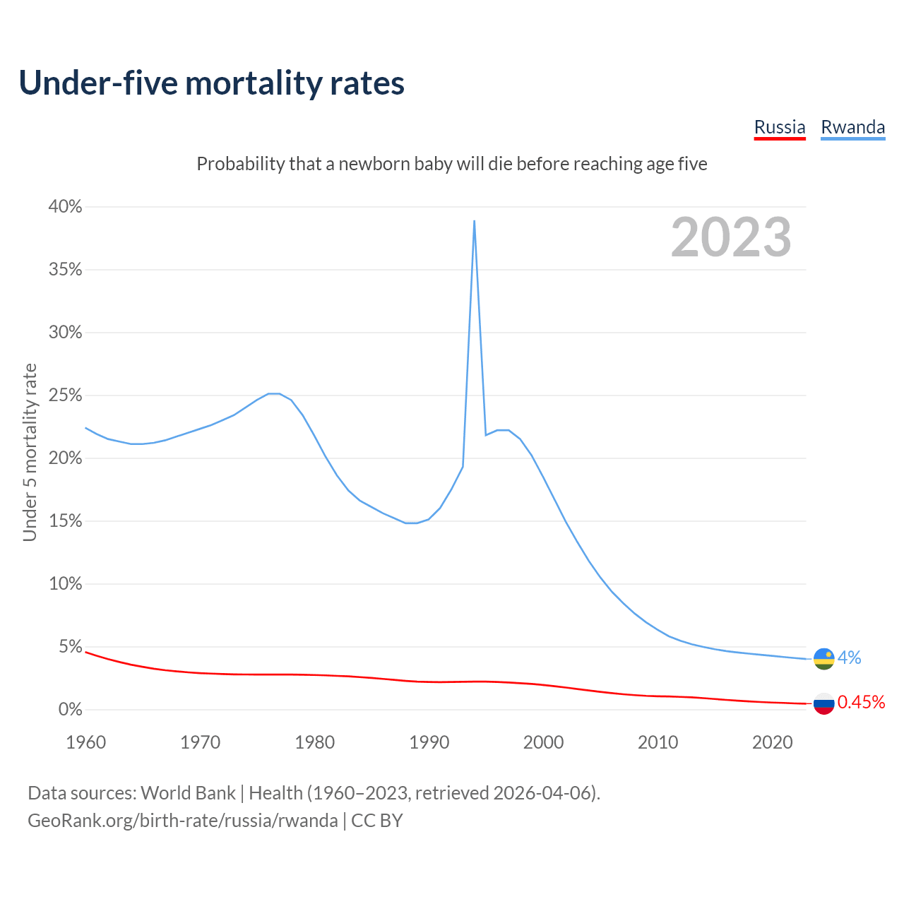 The chance that a newborn baby will die before reaching age five is 0.45% in Russia and 4% in Rwanda. Above is a chart with historical data on under-five mortality rates.