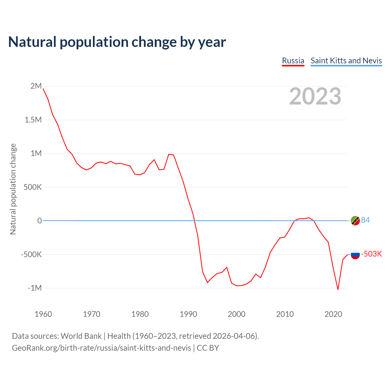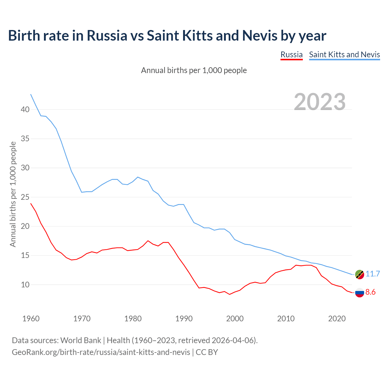 Russia has an annual birth rate of 8.6 births per 1,000 people, compared to 11.7 for Saint Kitts and Nevis. The average number of children a woman is expected to have during her lifetime — the fertility rate, is 1.41 in Russia and 1.51 in Saint Kitts and Nevis — 6.74% difference.