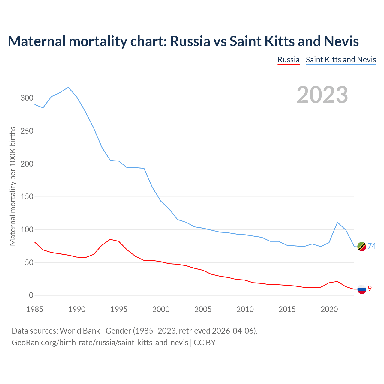 The maternal mortality rate, which is the probability of dying during childbirth or within 42 days of pregnancy termination, is 9 deaths per 100,000 live births in Russia, compared to 74 deaths in Saint Kitts and Nevis.