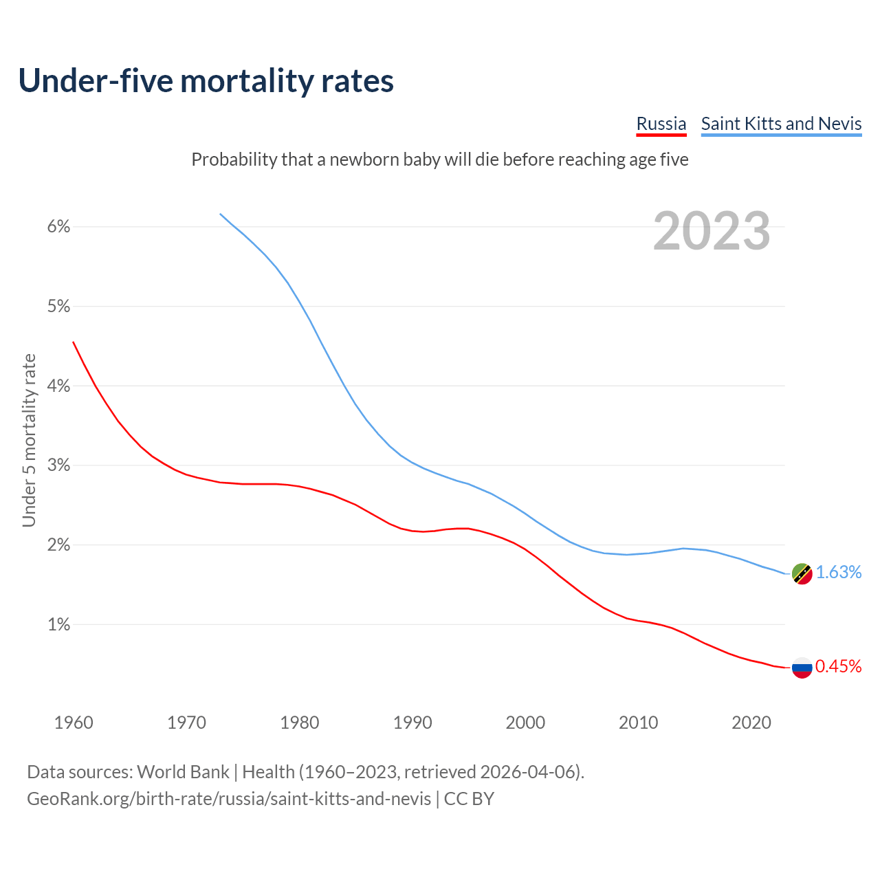 The chance that a newborn baby will die before reaching age five is 0.45% in Russia and 1.63% in Saint Kitts and Nevis. Above is a chart with historical data on under-five mortality rates.