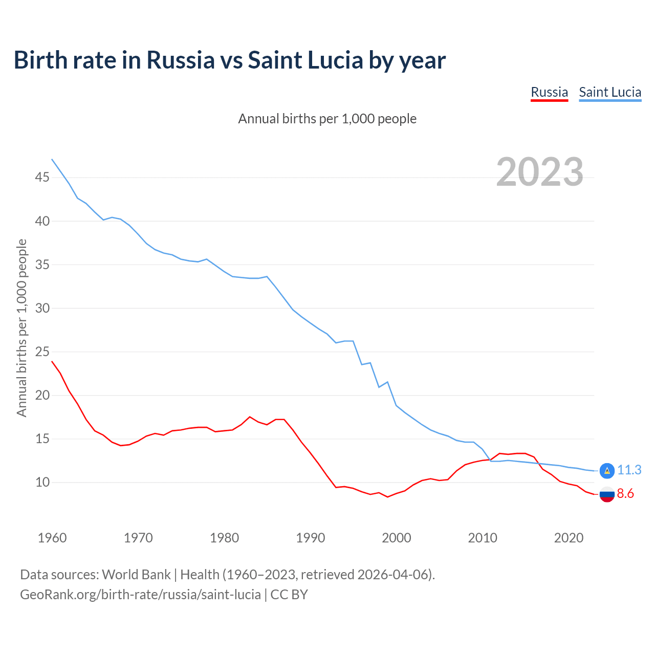 Russia has an annual birth rate of 8.6 births per 1,000 people, compared to 11.3 for Saint Lucia. The average number of children a woman is expected to have during her lifetime — the fertility rate, is 1.41 in Russia and 1.38 in Saint Lucia — 2.2% difference.