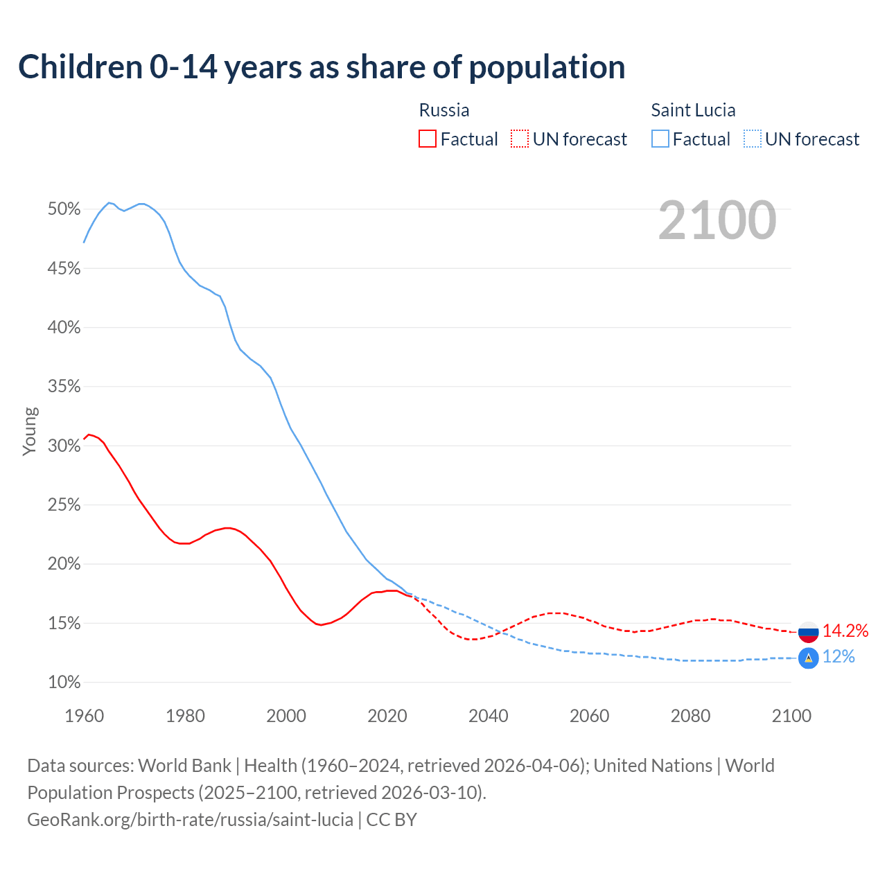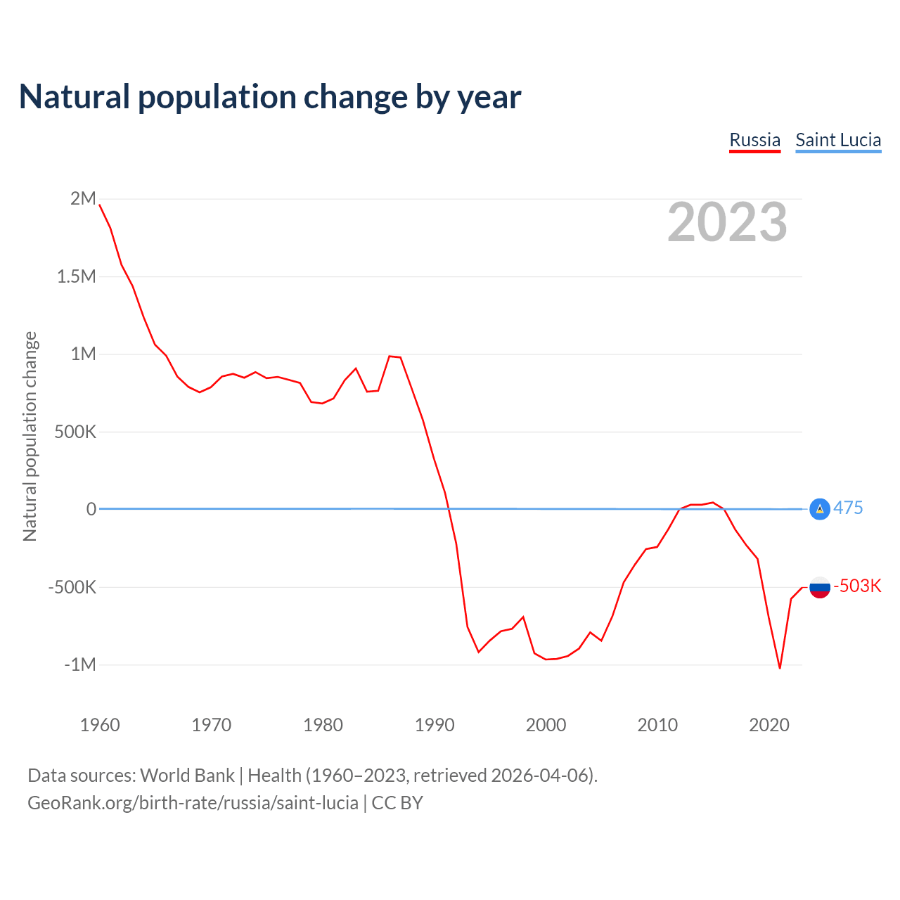 According to the latest available data on birth rates, the fertility rate in Russia was 1.41 children per woman in 2023, compared to 1.38 in Saint Lucia in 2023. The replacement level is considered to be 2.1 children per woman.
