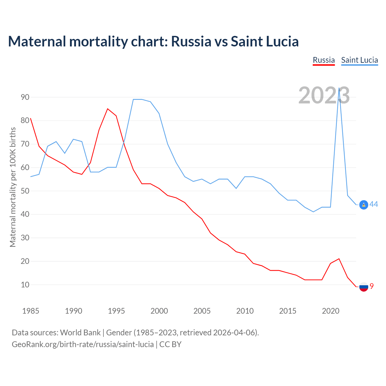 The maternal mortality rate, which is the probability of dying during childbirth or within 42 days of pregnancy termination, is 9 deaths per 100,000 live births in Russia, compared to 44 deaths in Saint Lucia.