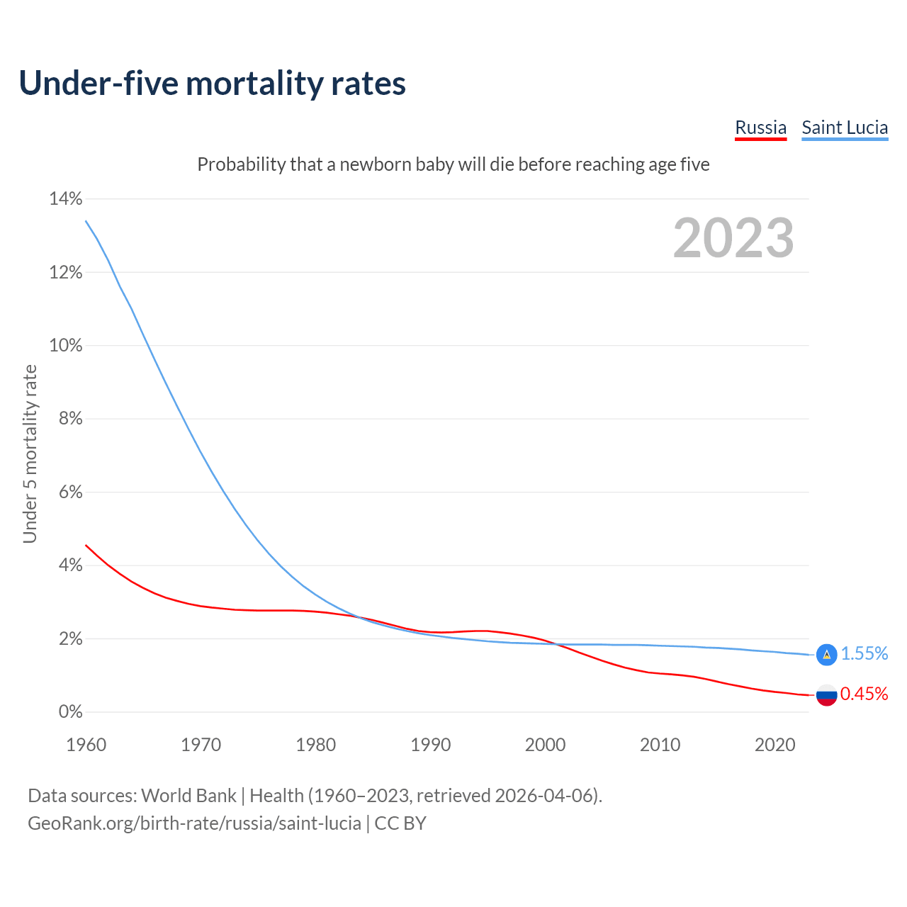 The chance that a newborn baby will die before reaching age five is 0.45% in Russia and 1.55% in Saint Lucia. Above is a chart with historical data on under-five mortality rates.