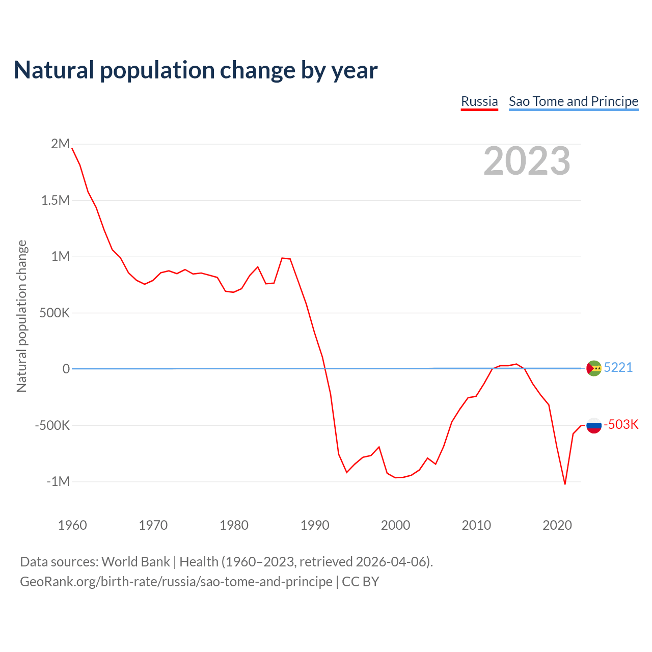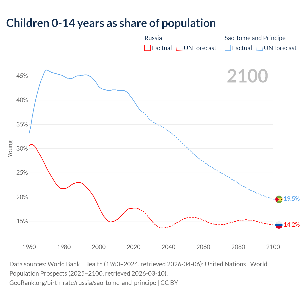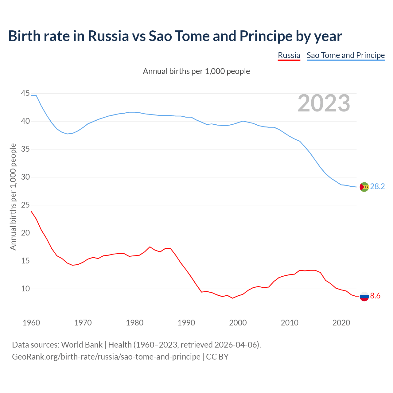 Russia has an annual birth rate of 8.6 births per 1,000 people, compared to 28.2 for Sao Tome and Principe. The average number of children a woman is expected to have during her lifetime — the fertility rate, is 1.41 in Russia and 3.64 in Sao Tome and Principe — 158.4% difference.