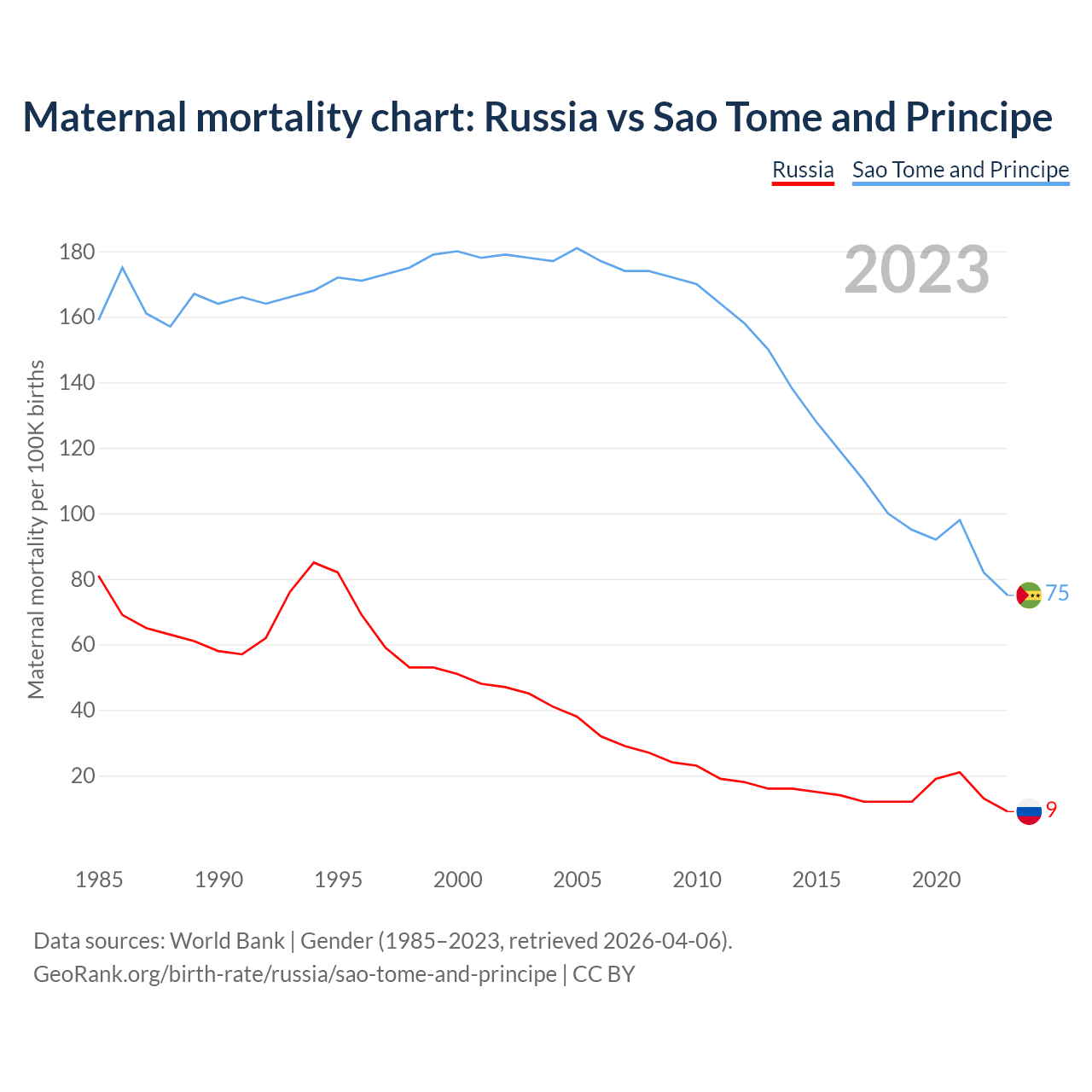- Annual births per 1,000 women ages 15-19 (adolescent birth rate or teenage mother rate) is 13 in Russia vs 86.2 in Sao Tome and Principe.