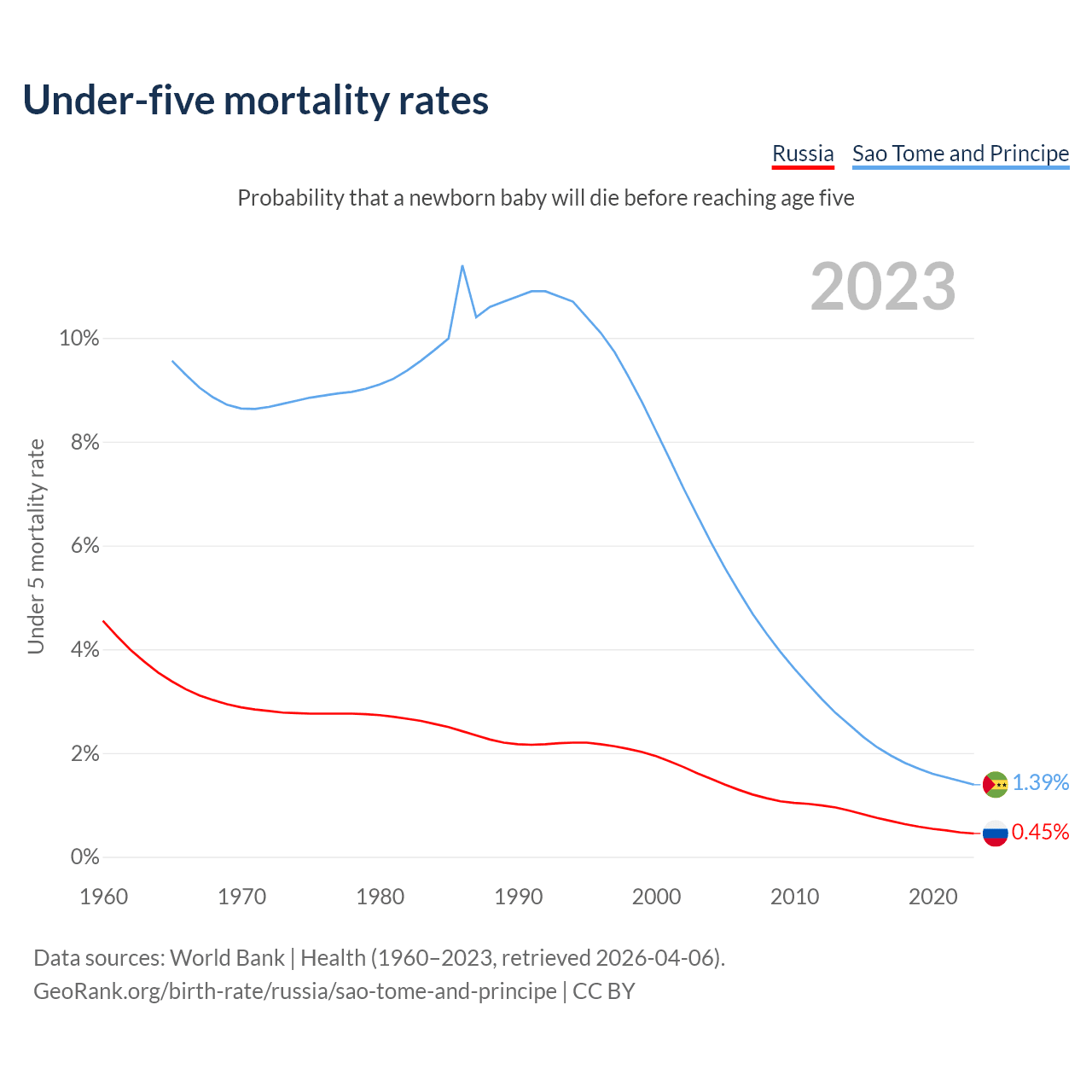 The chance that a newborn baby will die before reaching age five is 0.45% in Russia and 1.39% in Sao Tome and Principe. Above is a chart with historical data on under-five mortality rates.