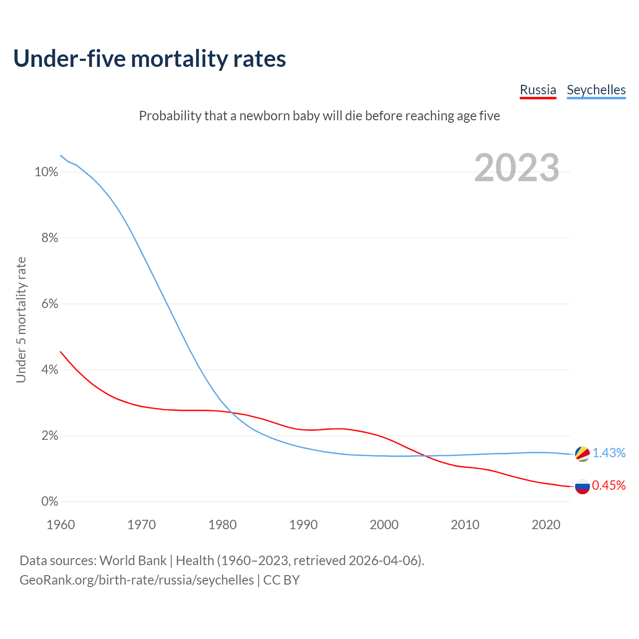 The chance that a newborn baby will die before reaching age five is 0.45% in Russia and 1.43% in the Seychelles. Above is a chart with historical data on under-five mortality rates.