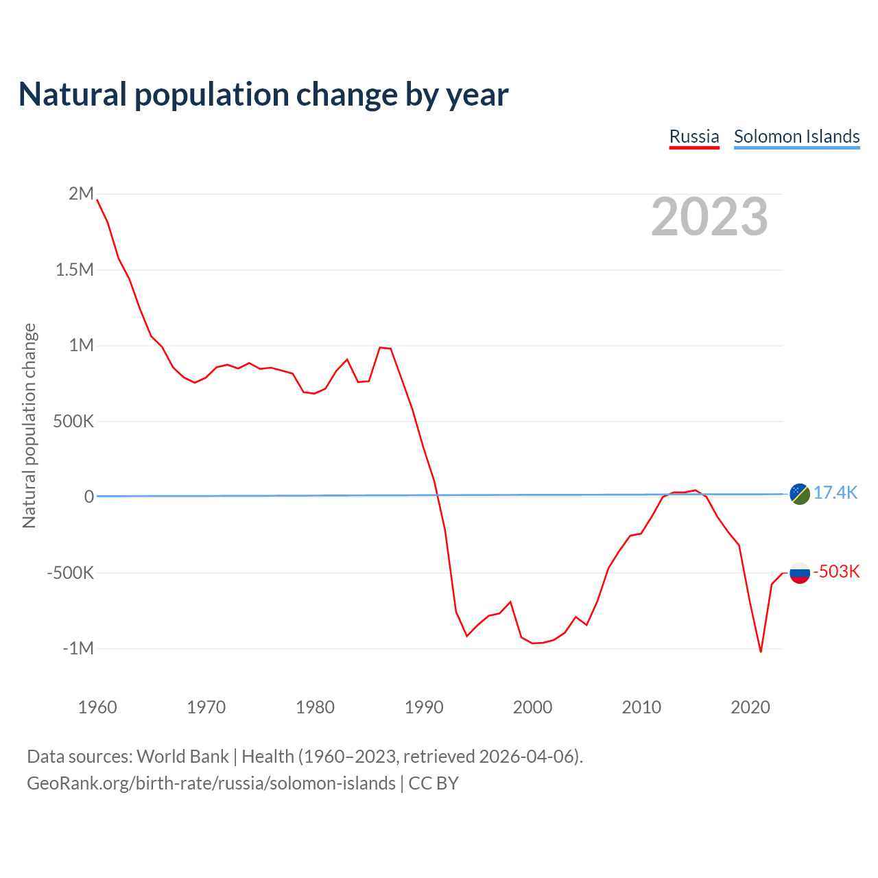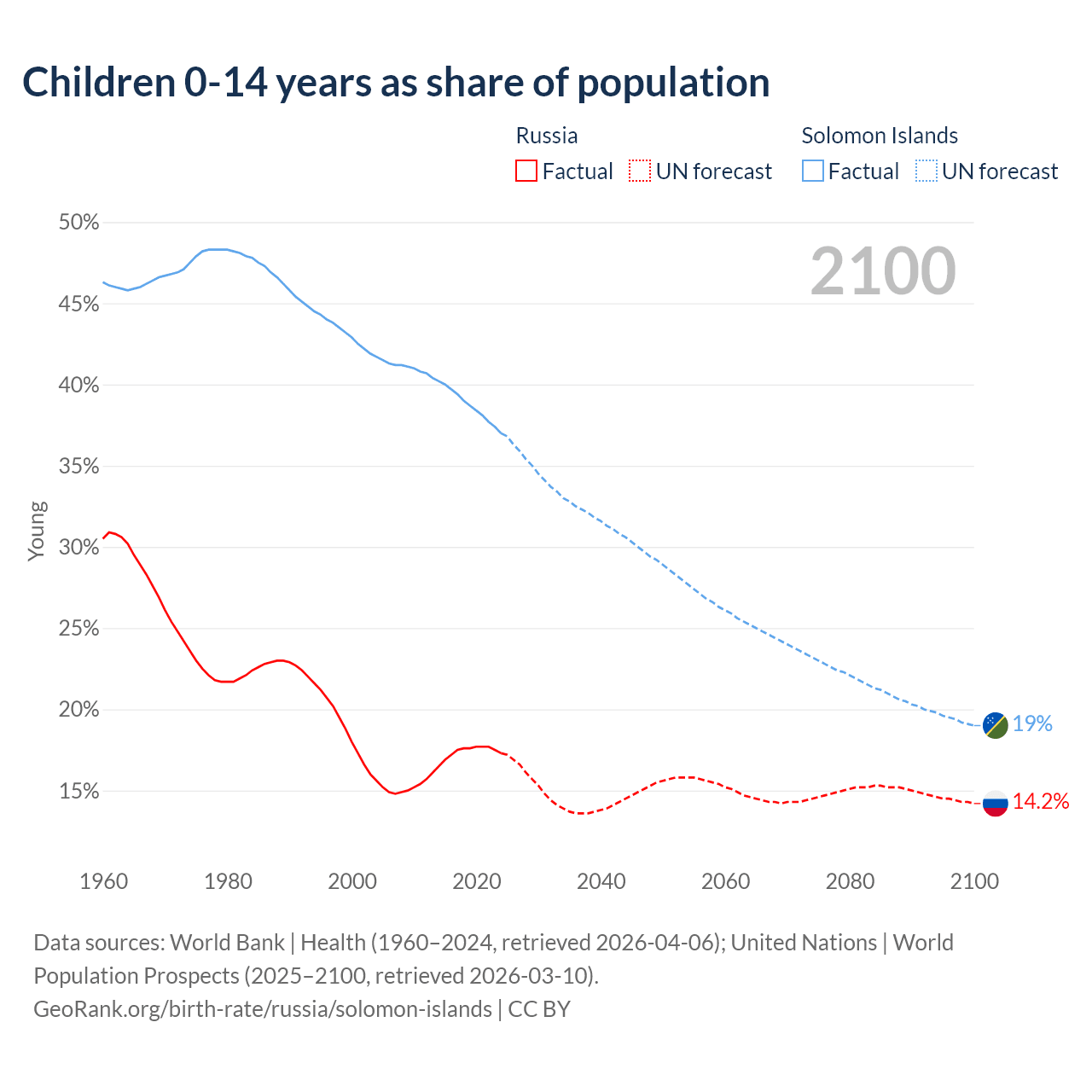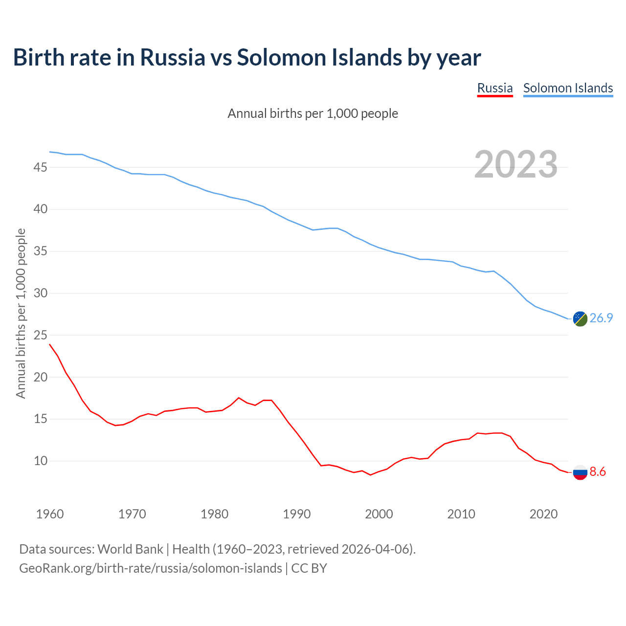 Russia has an annual birth rate of 8.6 births per 1,000 people, compared to 26.9 for the Solomon Islands. The average number of children a woman is expected to have during her lifetime — the fertility rate, is 1.41 in Russia and 3.56 in the Solomon Islands — 152.3% difference.