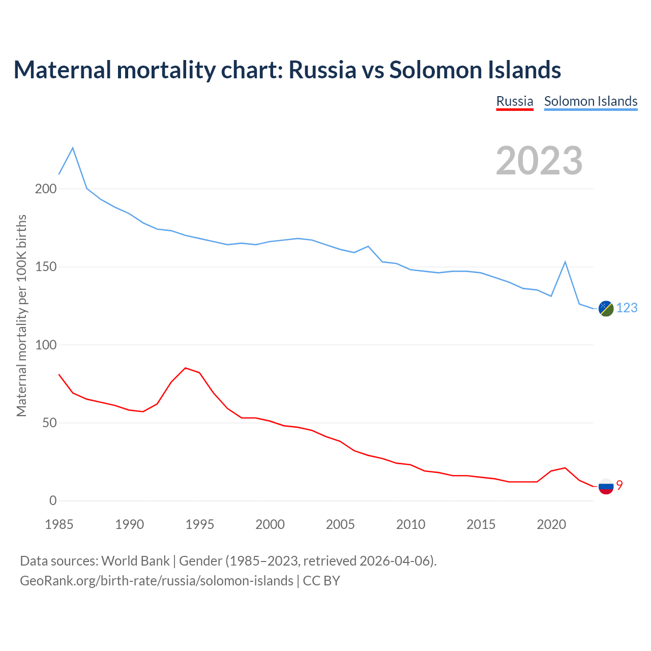 The maternal mortality rate, which is the probability of dying during childbirth or within 42 days of pregnancy termination, is 9 deaths per 100,000 live births in Russia, compared to 123 deaths in the Solomon Islands.