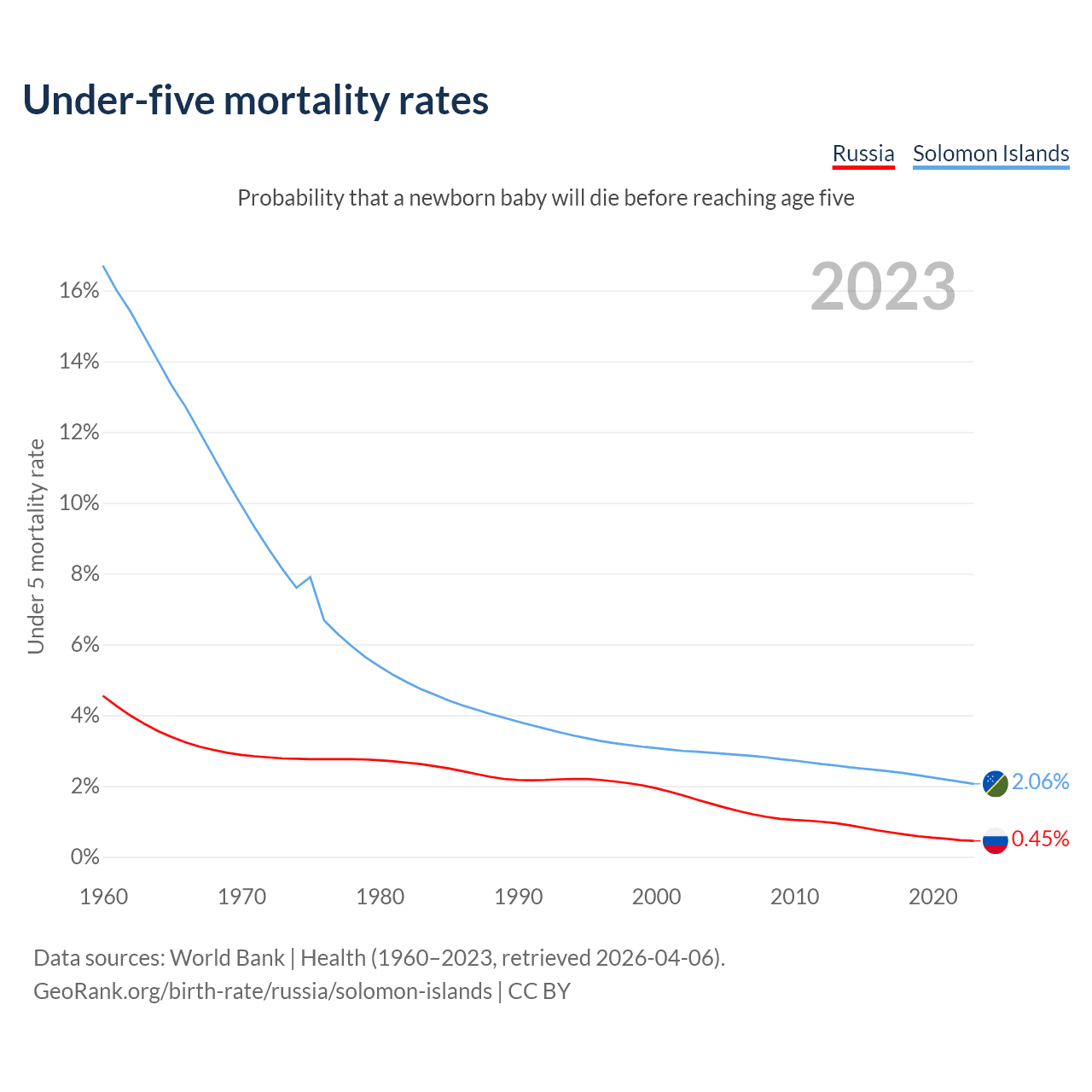 The chance that a newborn baby will die before reaching age five is 0.45% in Russia and 2.06% in the Solomon Islands. Above is a chart with historical data on under-five mortality rates.