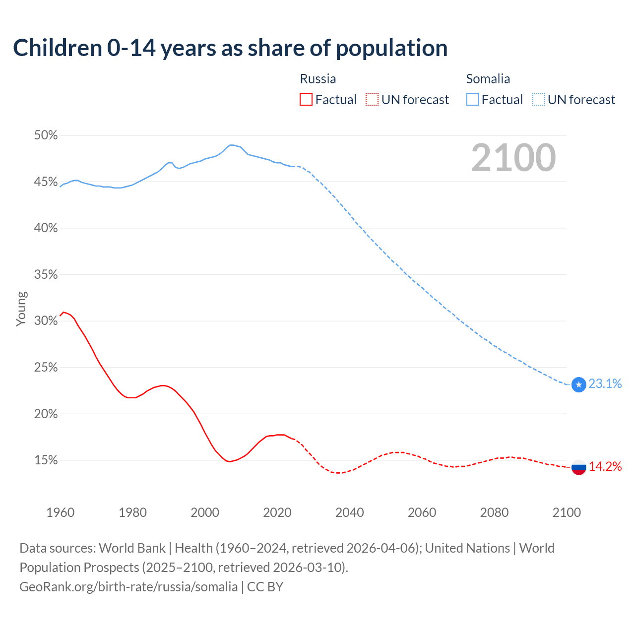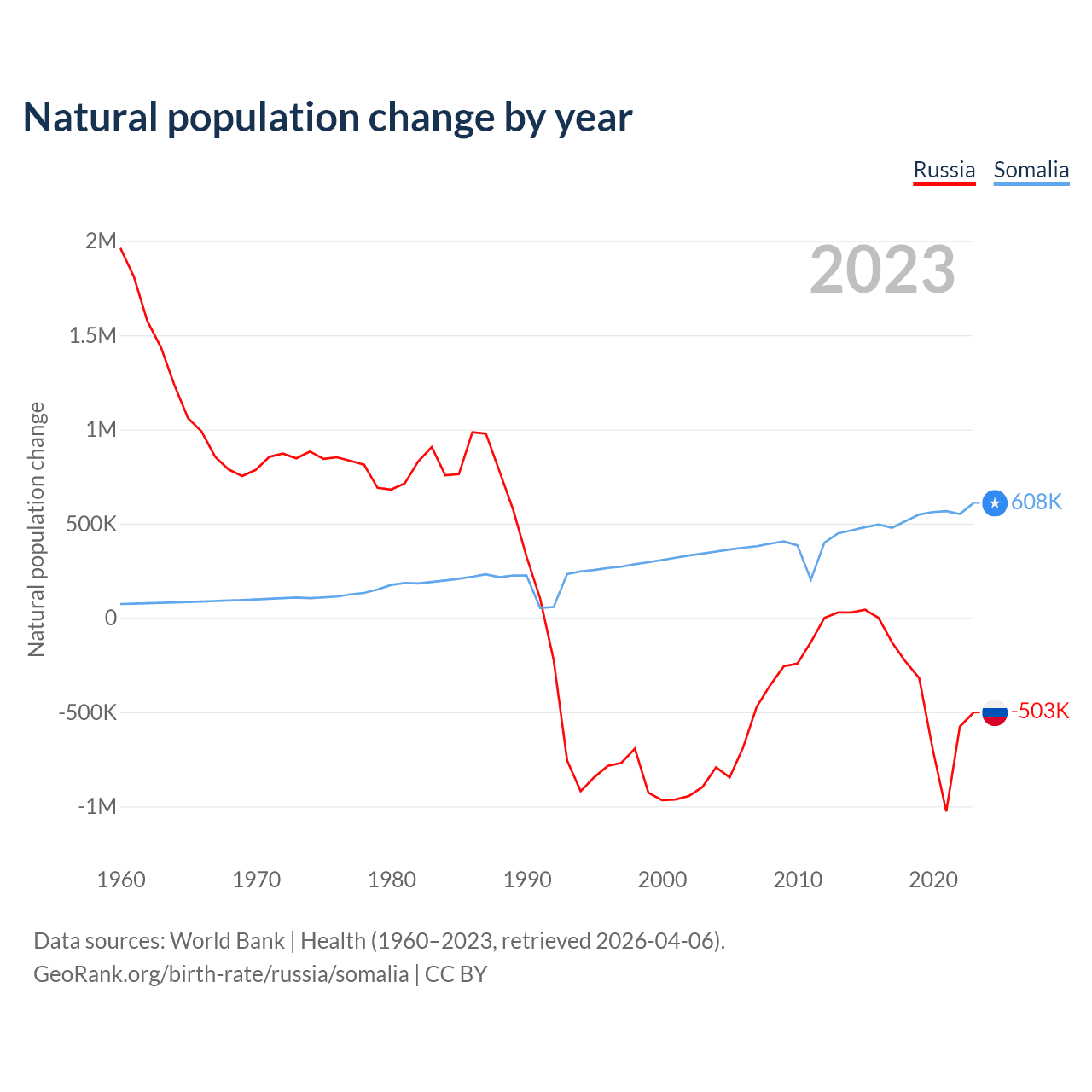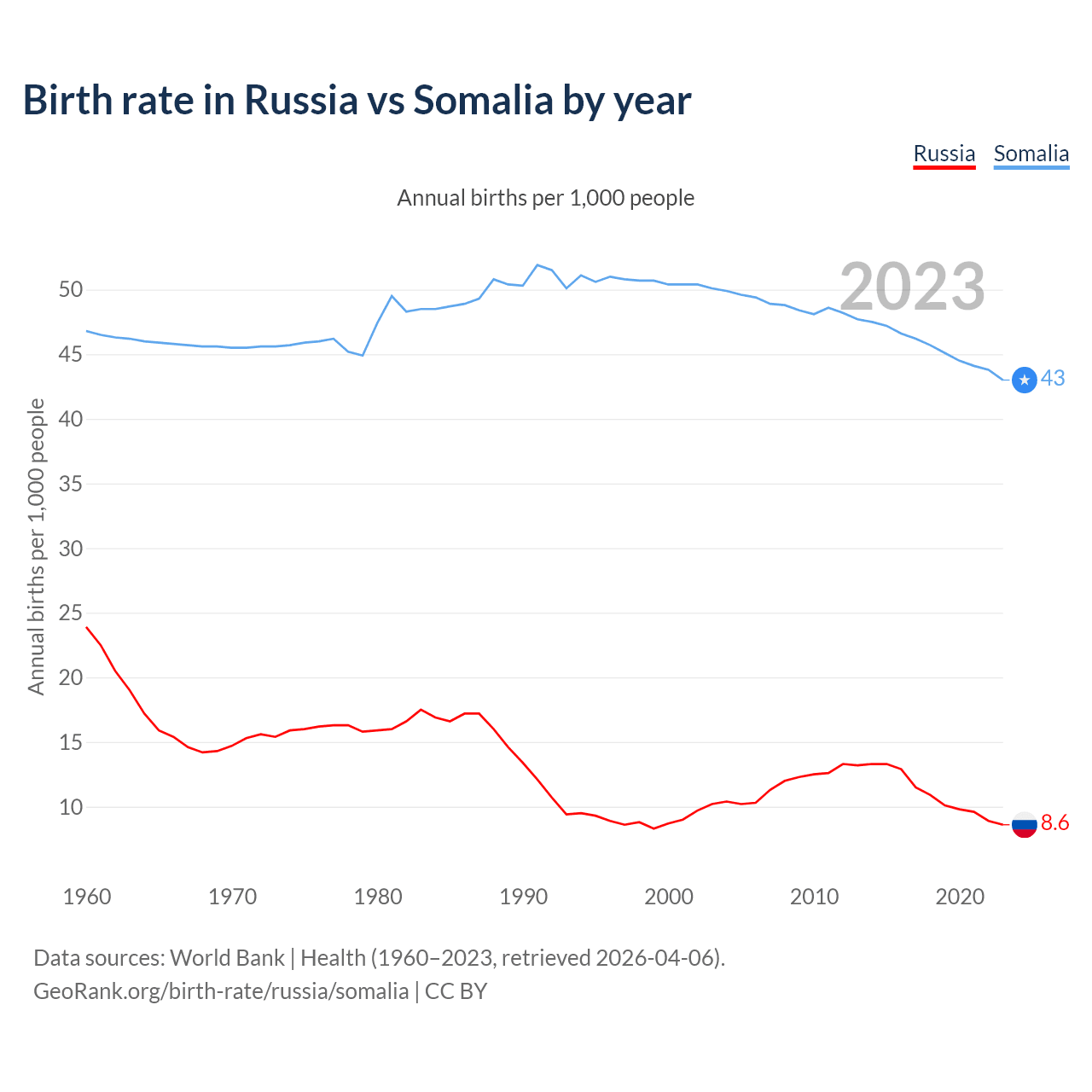 Russia has an annual birth rate of 8.6 births per 1,000 people, compared to 43 for Somalia. The average number of children a woman is expected to have during her lifetime — the fertility rate, is 1.41 in Russia and 6.13 in Somalia — 335% difference.