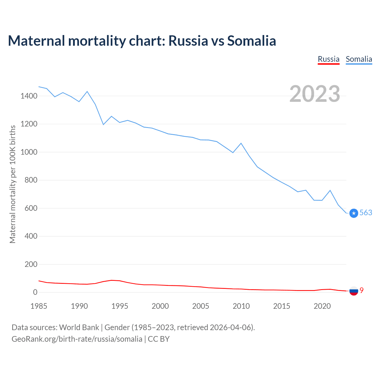 The maternal mortality rate, which is the probability of dying during childbirth or within 42 days of pregnancy termination, is 9 deaths per 100,000 live births in Russia, compared to 563 deaths in Somalia.