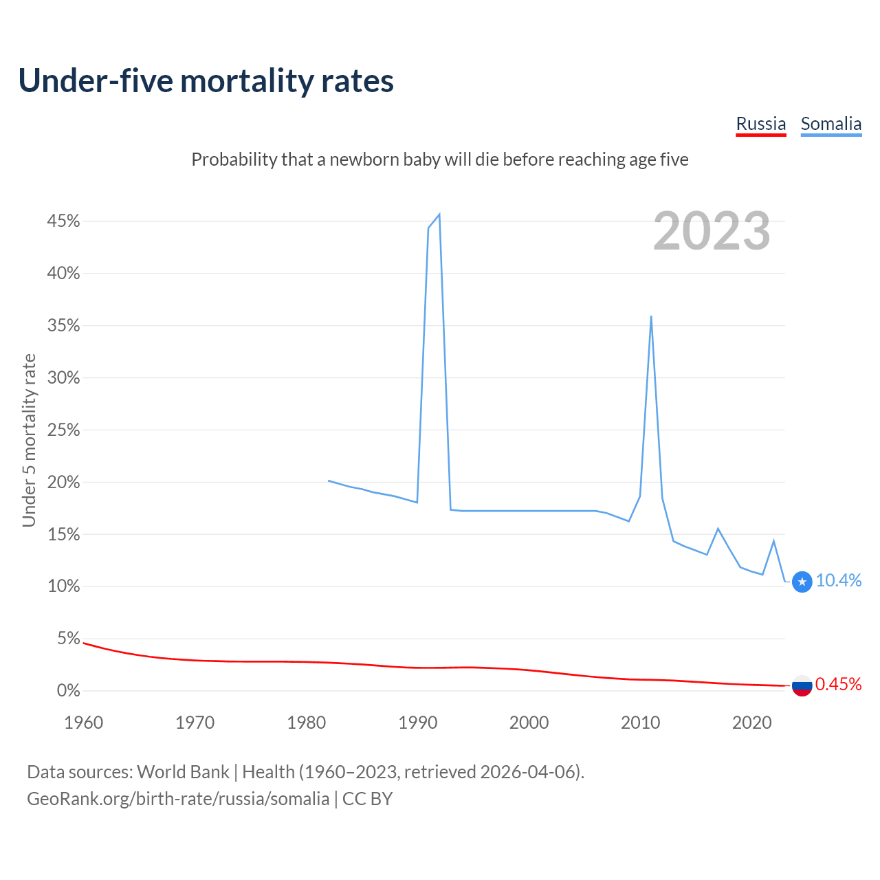 The chance that a newborn baby will die before reaching age five is 0.45% in Russia and 10.4% in Somalia. Above is a chart with historical data on under-five mortality rates.