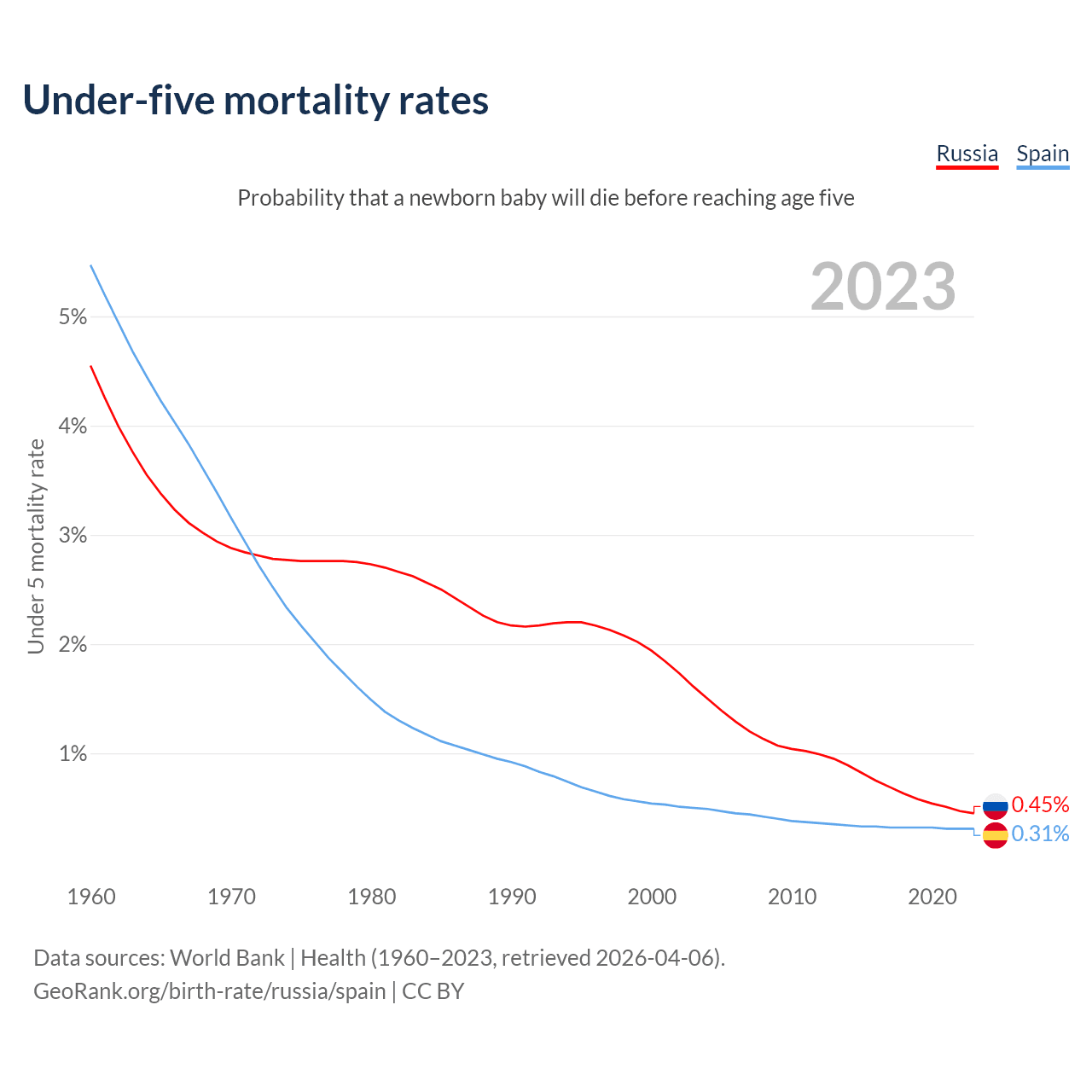 The chance that a newborn baby will die before reaching age five is 0.45% in Russia and 0.31% in Spain. Above is a chart with historical data on under-five mortality rates.