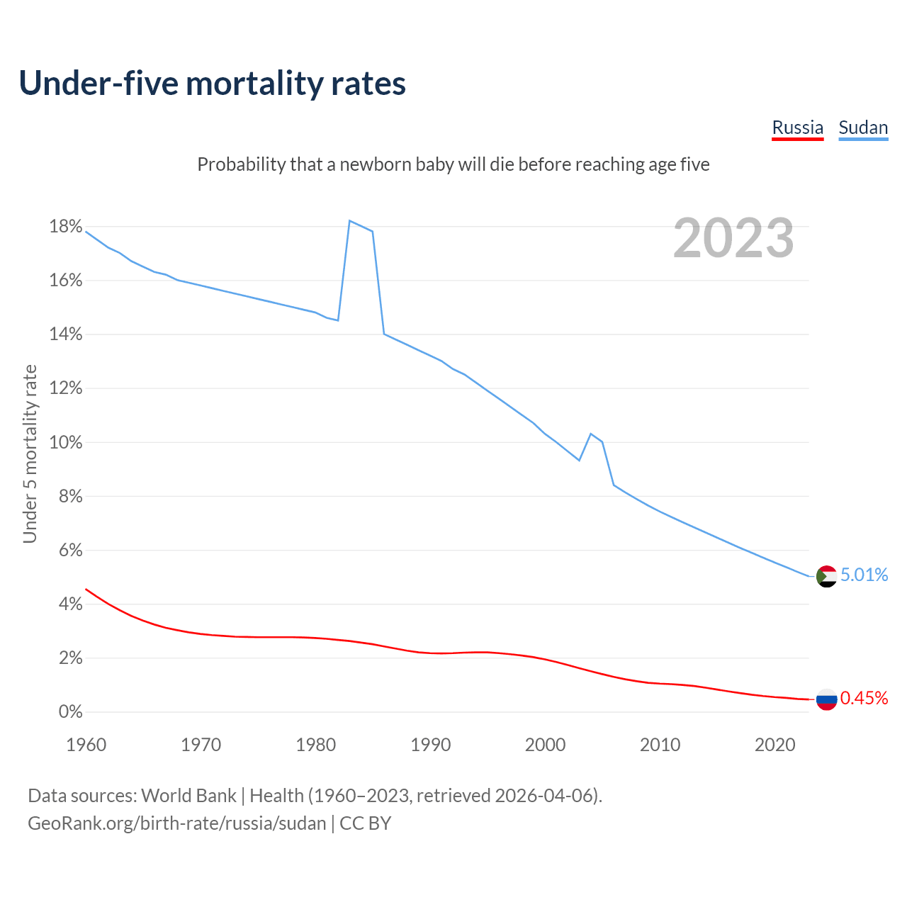 The chance that a newborn baby will die before reaching age five is 0.45% in Russia and 5.01% in Sudan. Above is a chart with historical data on under-five mortality rates.