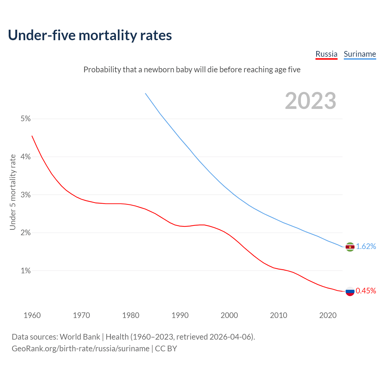 The chance that a newborn baby will die before reaching age five is 0.45% in Russia and 1.62% in Suriname. Above is a chart with historical data on under-five mortality rates.