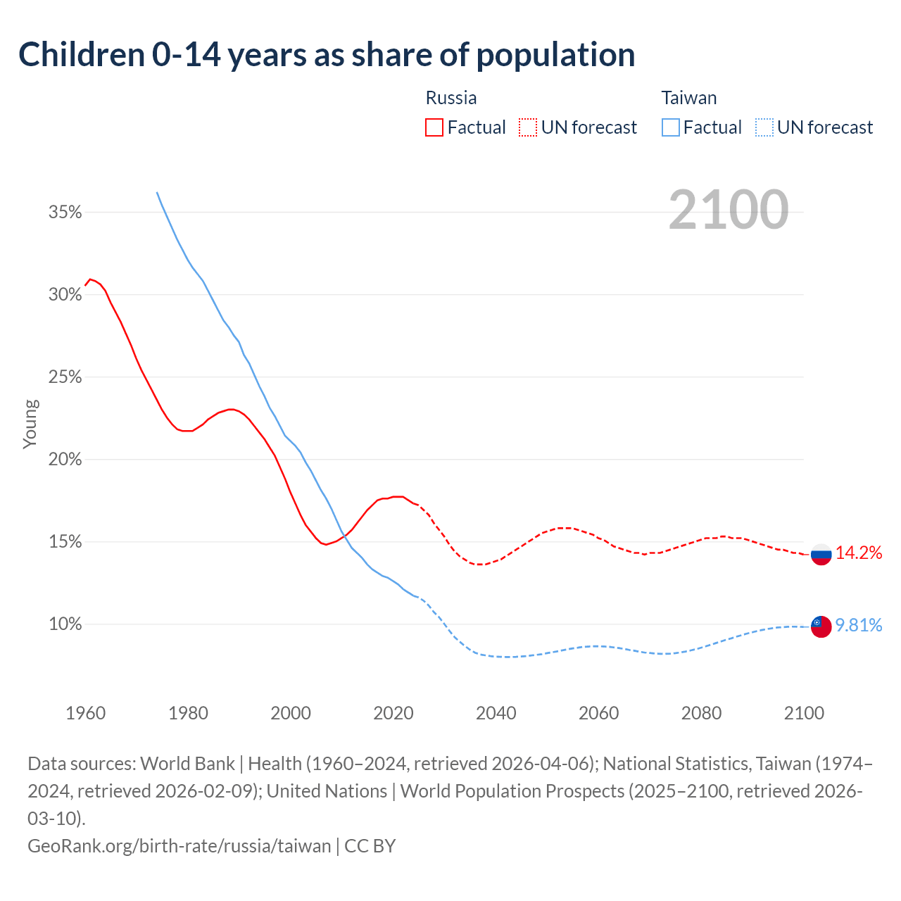 According to the latest available data on birth rates, the fertility rate in Russia was 1.41 children per woman in 2023, compared to 0.89 in Taiwan in 2024. The replacement level is considered to be 2.1 children per woman.