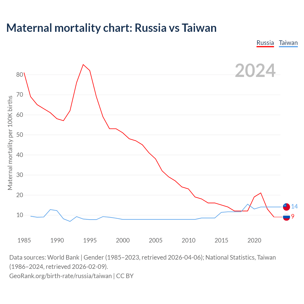 The maternal mortality rate, which is the probability of dying during childbirth or within 42 days of pregnancy termination, is 9 deaths per 100,000 live births in Russia, compared to 14 deaths in Taiwan.