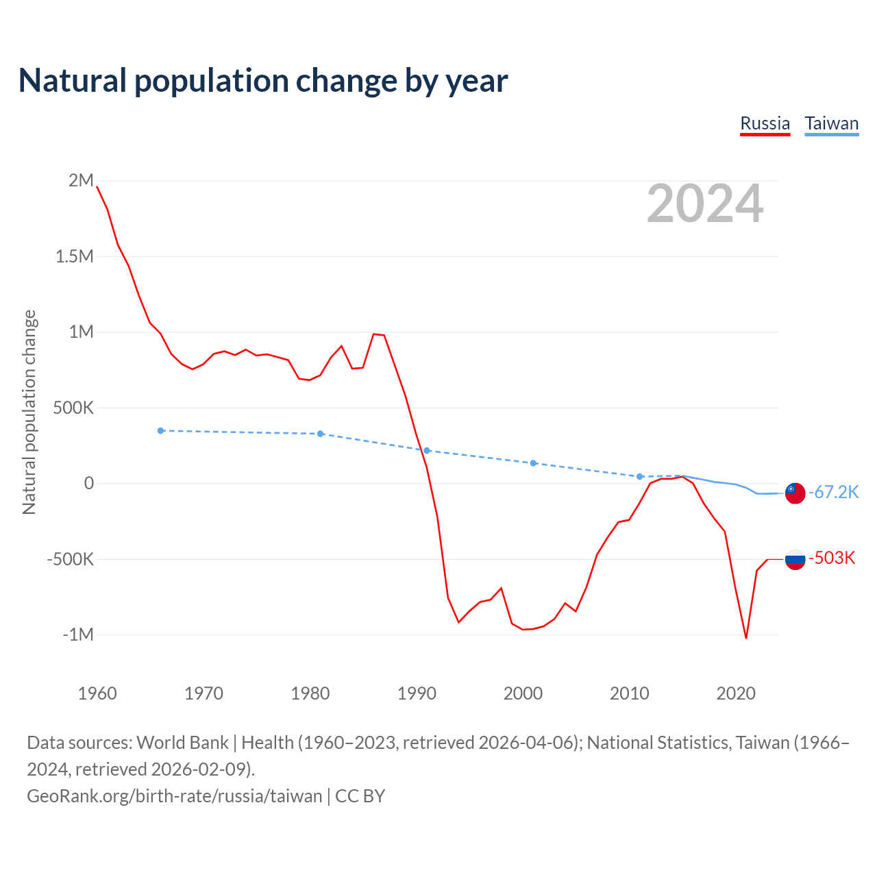 Russia has an annual birth rate of 8.6 births per 1,000 people, compared to 5.76 for Taiwan. The average number of children a woman is expected to have during her lifetime — the fertility rate, is 1.41 in Russia and 0.89 in Taiwan — 37.2% difference.