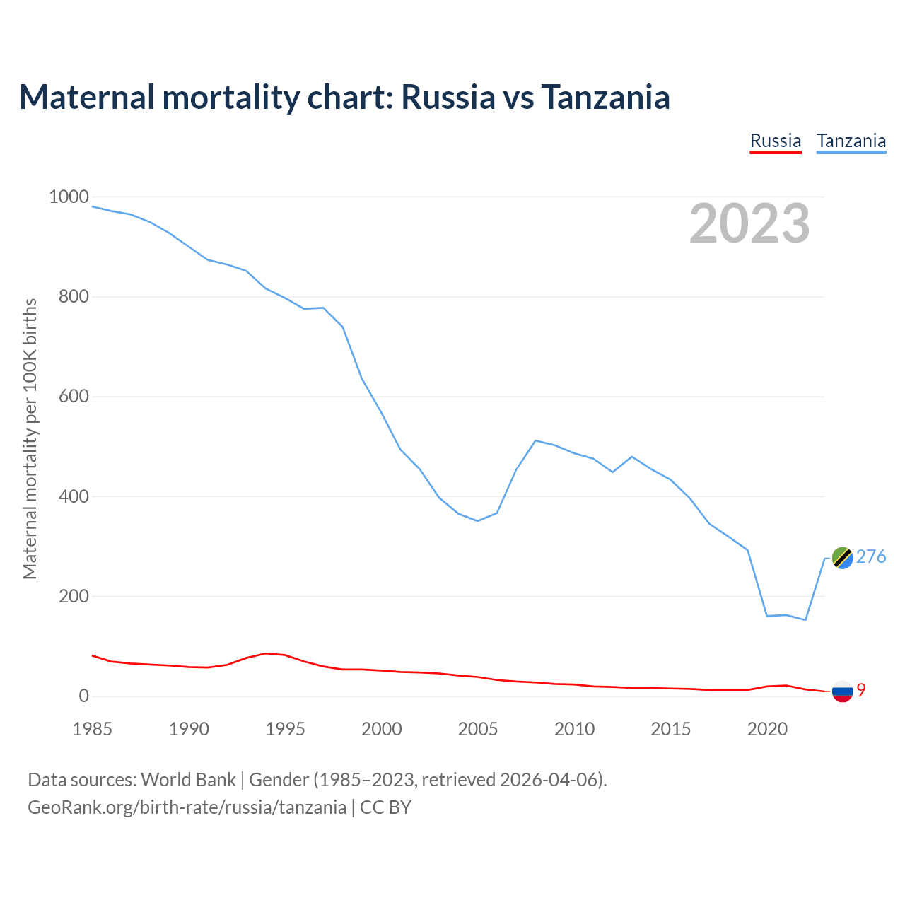 The maternal mortality rate, which is the probability of dying during childbirth or within 42 days of pregnancy termination, is 9 deaths per 100,000 live births in Russia, compared to 276 deaths in Tanzania.