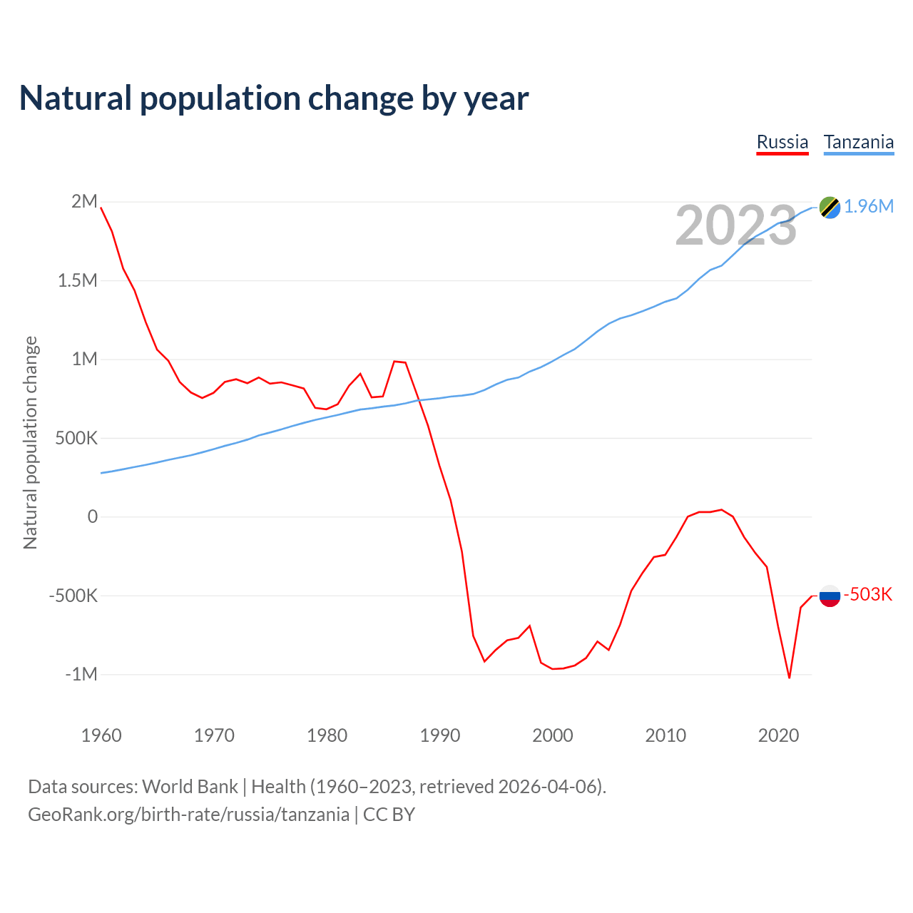 According to the latest available data on birth rates, the fertility rate in Russia was 1.41 children per woman in 2023, compared to 4.61 in Tanzania in 2023. The replacement level is considered to be 2.1 children per woman.