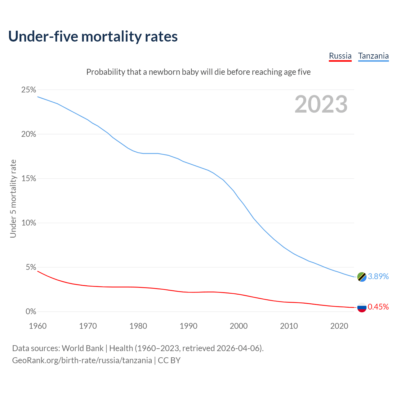The chance that a newborn baby will die before reaching age five is 0.45% in Russia and 3.89% in Tanzania. Above is a chart with historical data on under-five mortality rates.