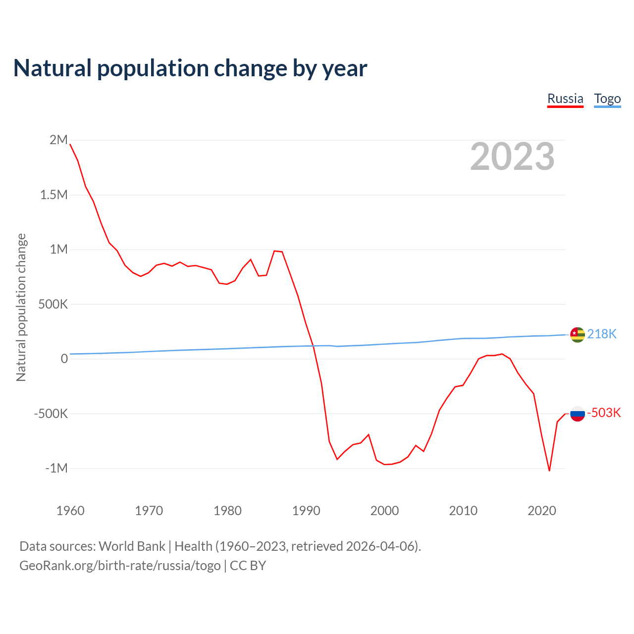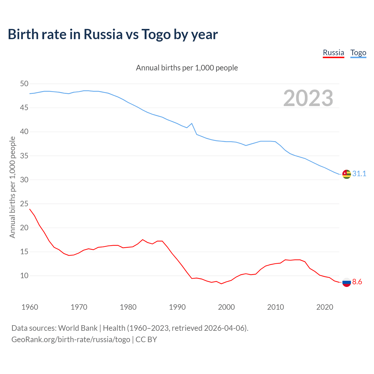 Russia has an annual birth rate of 8.6 births per 1,000 people, compared to 31.1 for Togo. The average number of children a woman is expected to have during her lifetime — the fertility rate, is 1.41 in Russia and 4.19 in Togo — 197.3% difference.