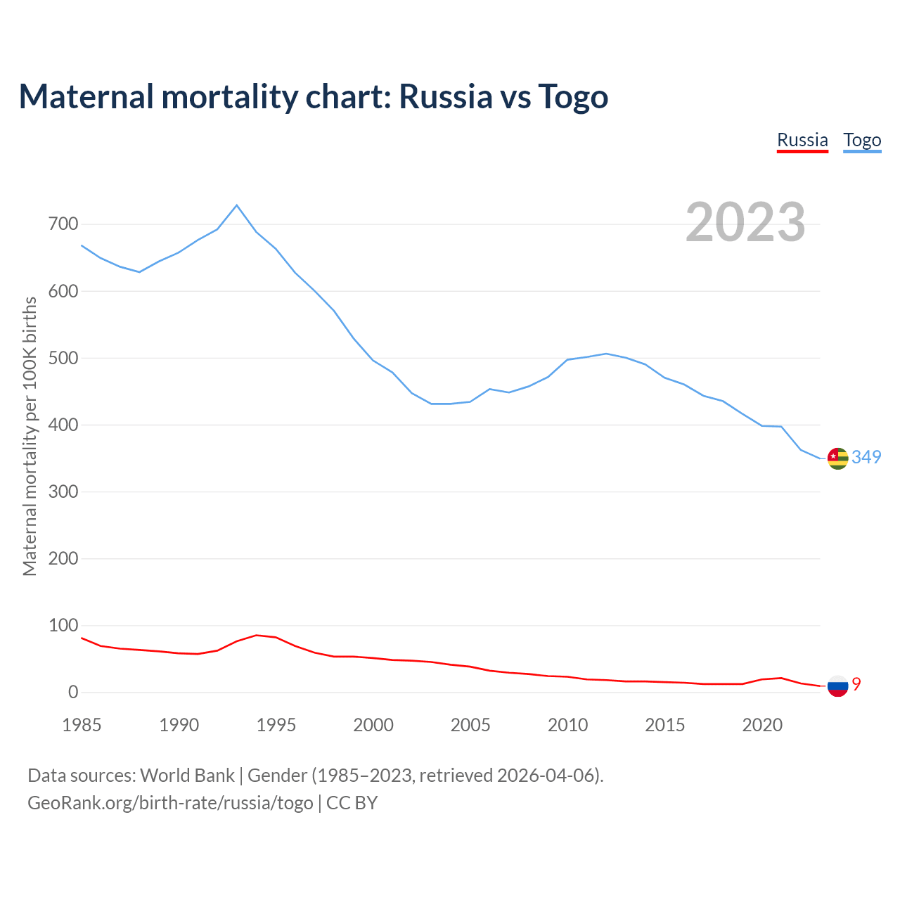 The maternal mortality rate, which is the probability of dying during childbirth or within 42 days of pregnancy termination, is 9 deaths per 100,000 live births in Russia, compared to 349 deaths in Togo.