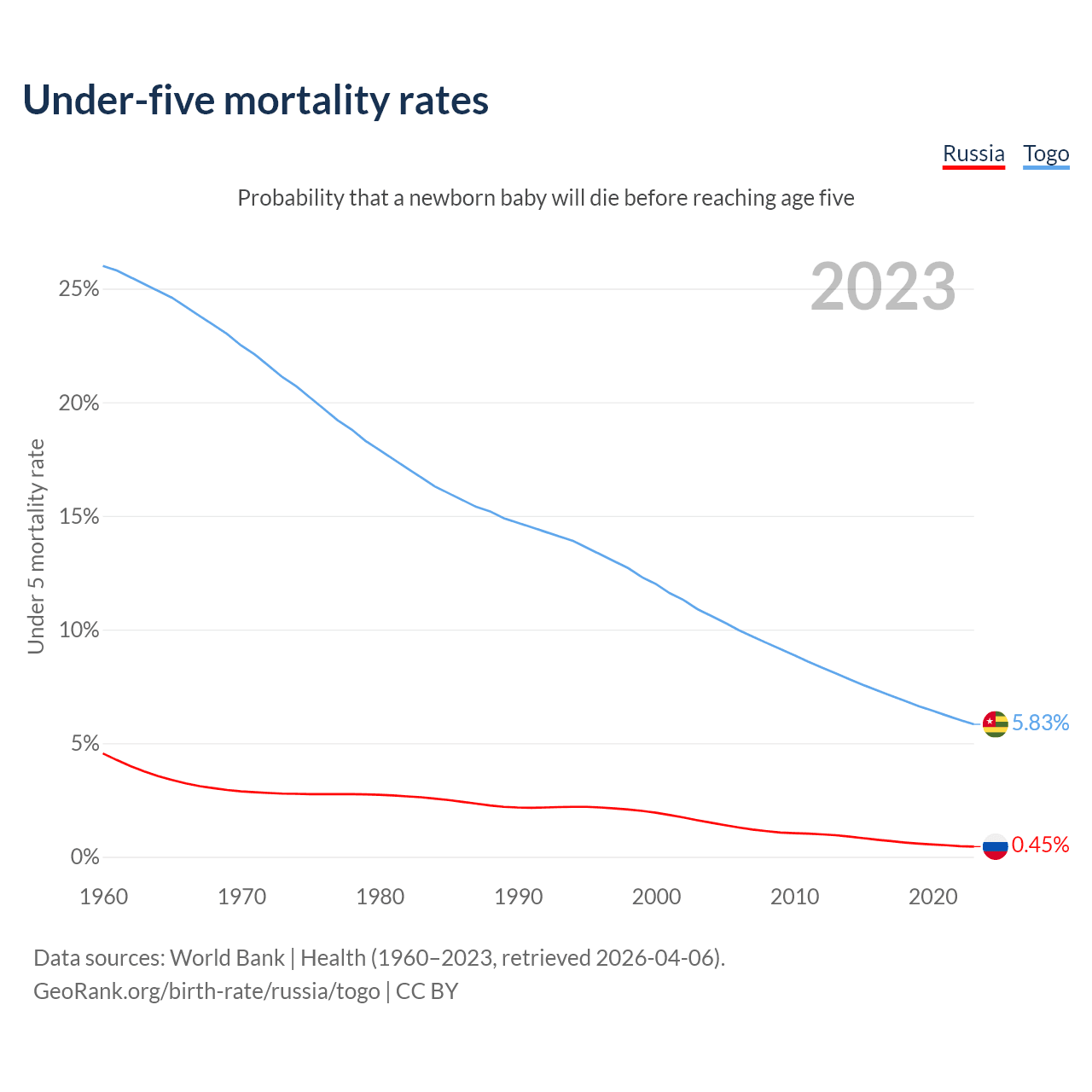 The chance that a newborn baby will die before reaching age five is 0.45% in Russia and 5.83% in Togo. Above is a chart with historical data on under-five mortality rates.